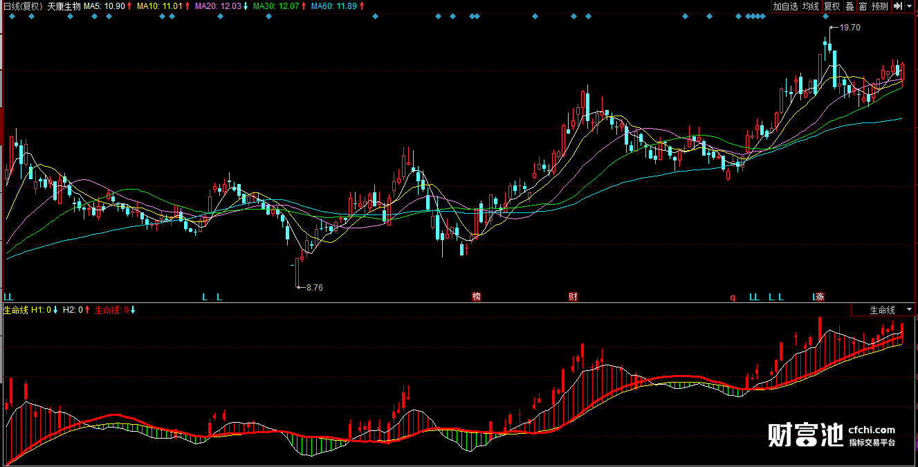 生命线是大盘的中期生命线,每当一轮中期下跌结束指数向上突破30日均线,往往会有一轮中期上升。生命线是判断个股有主力无主力、主力出没出货以及其走势强弱的标准。生命线有着非常的趋势性,无论其上升趋势还是下跌趋势一旦形成均很难改变。