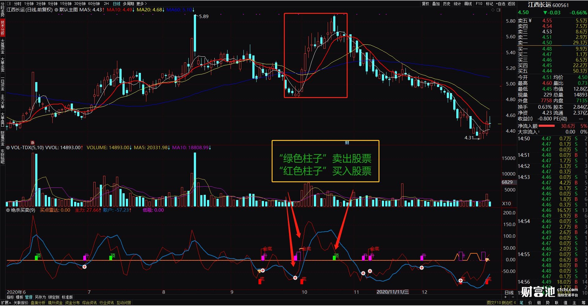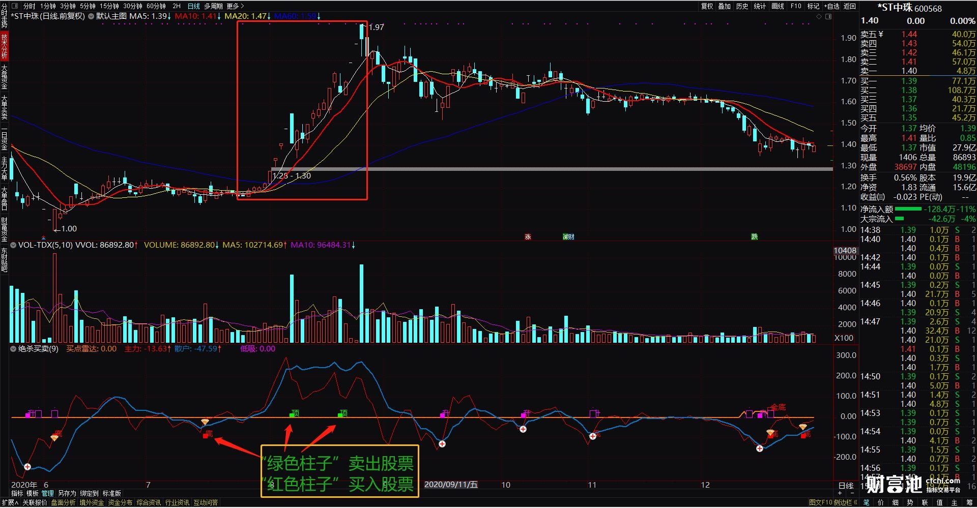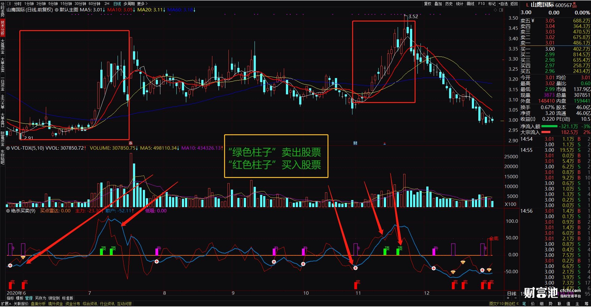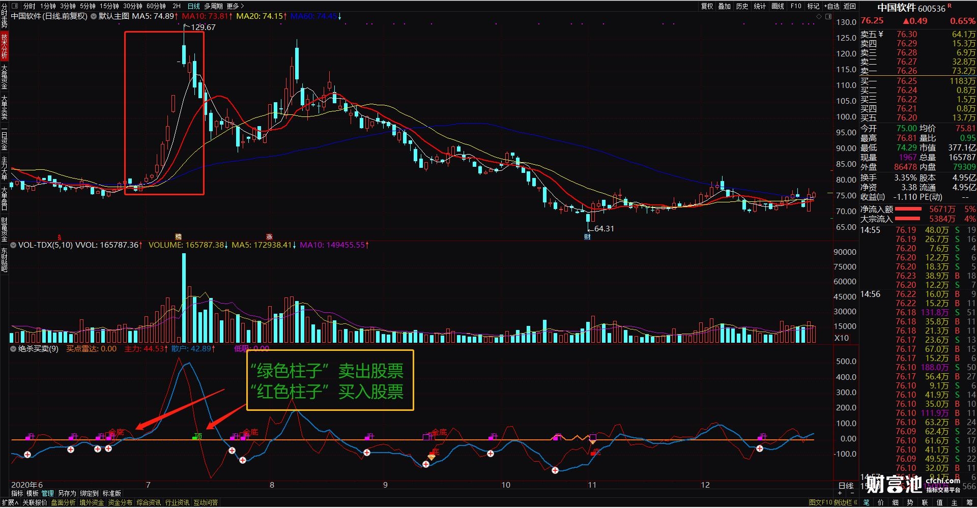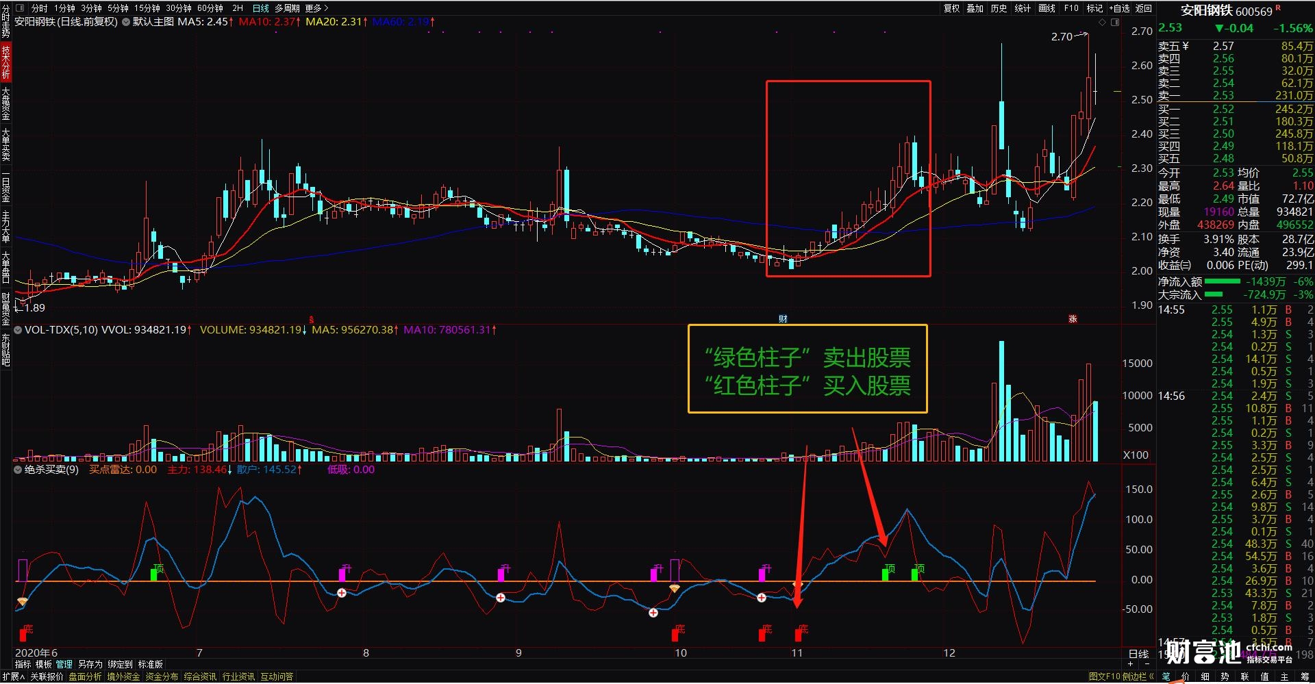 看到“绿色柱子”就卖出股票,看到“红色柱子”就买入股票,“粉色柱子”代表该股呈现上涨趋势。