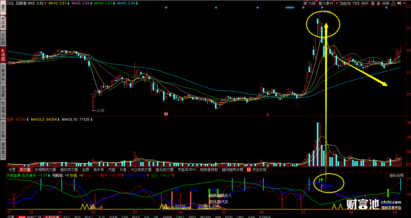 卖出点:当出现绿色向下箭头或是“注意转折”信号的时候,要注意观察,然后及时卖出