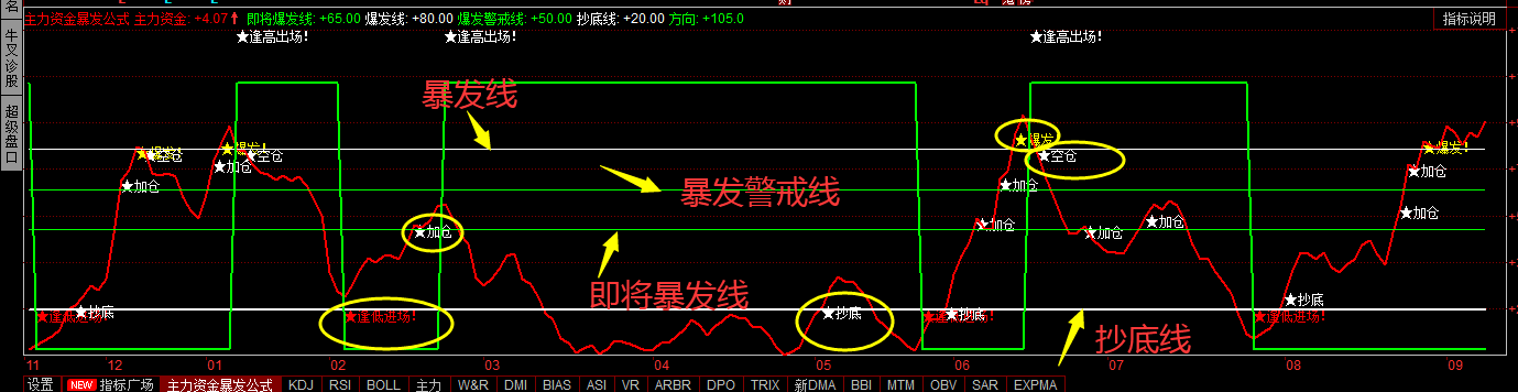 本指标的图形非常清晰易懂,信号也很简单。本指标由“抄底线”,“即将暴发线”,“暴发线”,“暴发警戒线”,“抄底”信号,“逢低进场”信号,“空仓”信号,“爆发”信号组成。