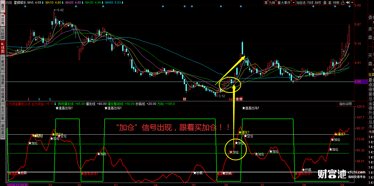 当红色的“主力资金”走线慢慢往上走,靠近暴发线,并出现了“加仓”信号时,就是加仓的好机会,跟着主力大力加仓,多赚一笔!
