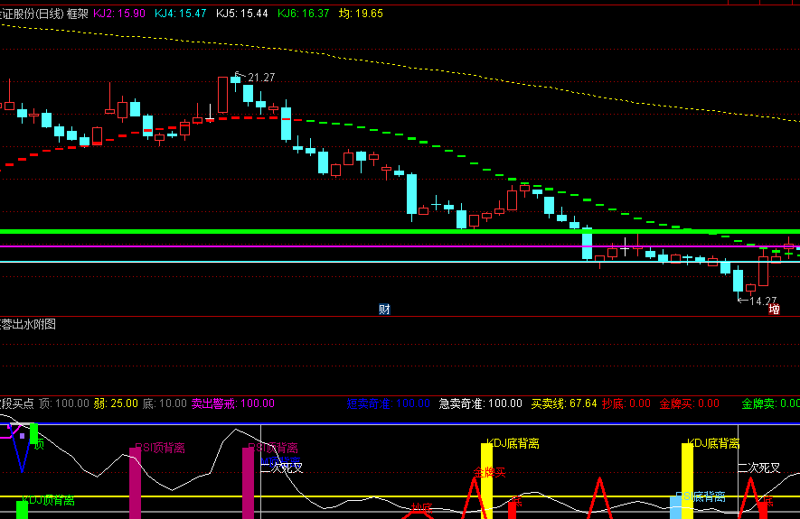 KDJ顶背离:STICKLINE(FILTER(D2>0,5),2,21,3,0),COLOR00FF00;{5天内D2>0的条件不被记录在内,在当前周期内出现D2>0画红色柱线}