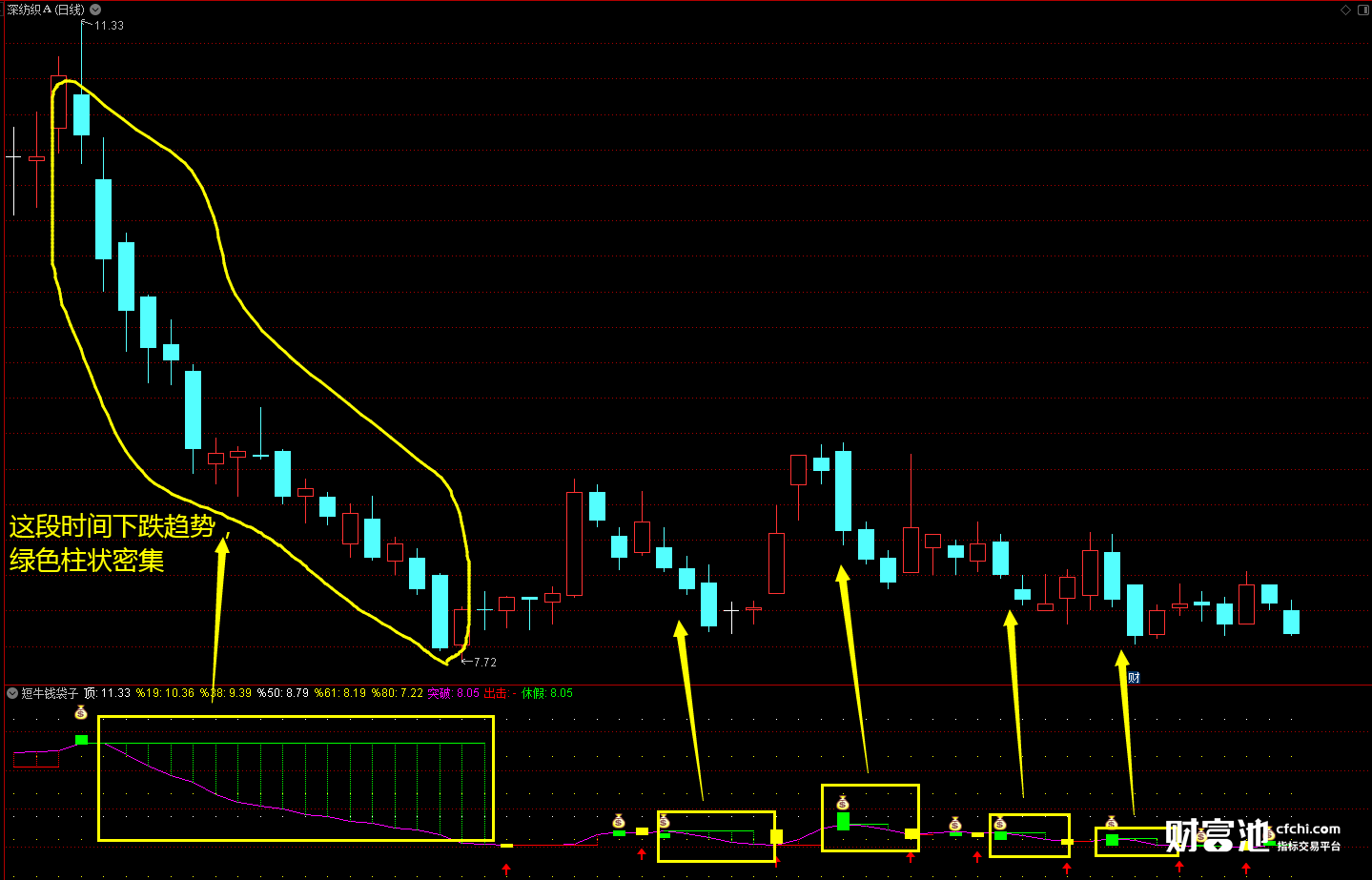绿色柱状代表下跌,当绿色柱状越长,代表下跌的幅度越大,