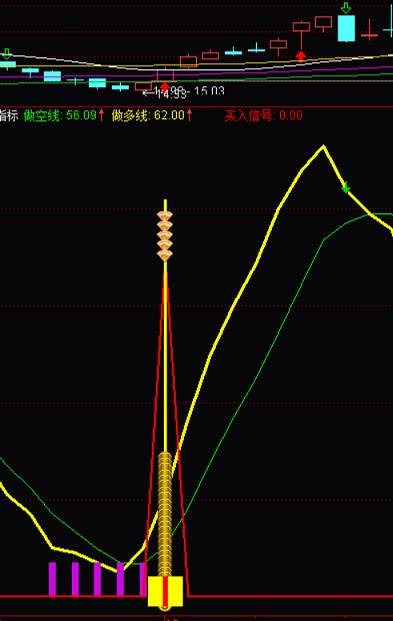 底部出现粉红色线条开始关注,这是大资金或主力在底部吸筹的表现,紧随粉红线条出现美丽金钻时可抄底,再次出现金钻时为二次抄底或买入,黄色线为做多线,绿色线为做空线,金做多叉做空线为二买或三买,做多线死叉做空线酌情减仓或清仓,出现绿色向下箭头时减仓或清仓。