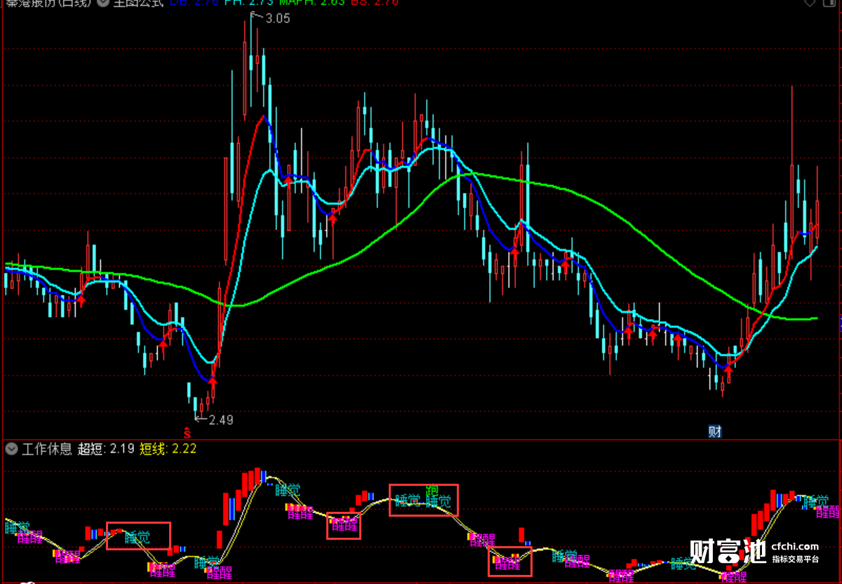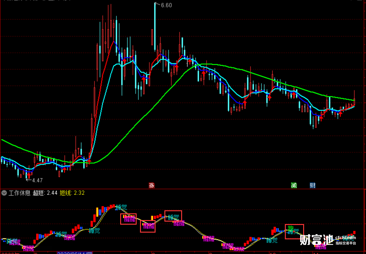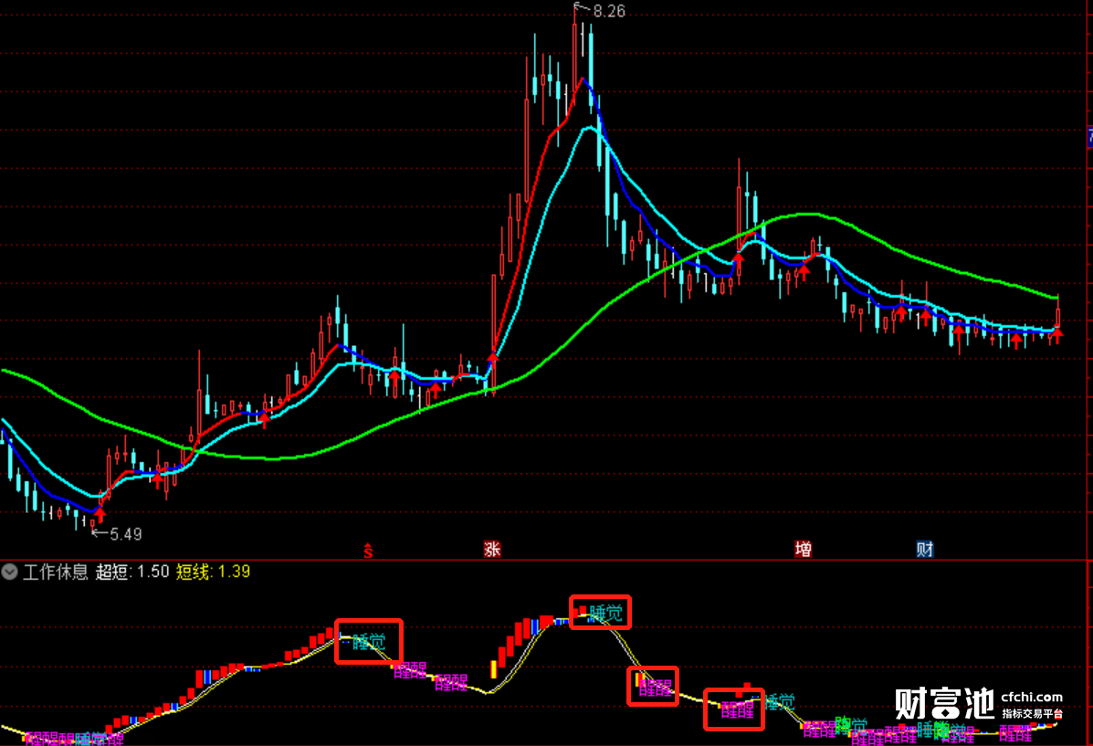 从副图中我们可以清晰看到出现最多文字就是睡觉和醒醒这两个词,当看到醒醒时,你会发现股票处于最低点,这时你可以考虑买入股票就该醒醒啦;当看到睡觉时,你会发现股票处于最高点,接下来股票会下跌,这时你需要赶紧跑,把手中的股票卖出!