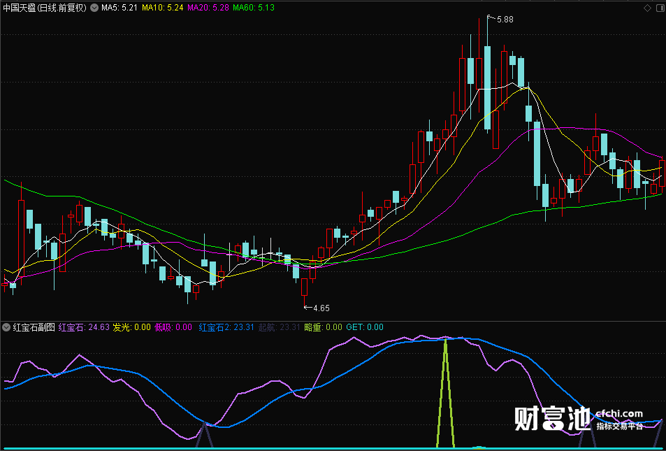 get是不同于前述各种信号的另一套衡量系统,它的提示,一般是表明股票有一段短期的上攻动力。由于此系统和均线以及前述信号不属于同一原理,因此均线,红宝石上穿和此结合判断个股走势尤为重要。当红宝石出现死叉情况,均线也出现死叉;或者红宝石的数值已经超过90%,代表一种高危状态,此时如果get仍然未曾关闭信号,但使用者应考虑适时出局,以避免获利回吐。