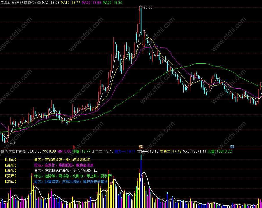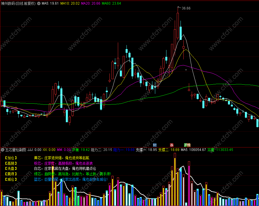 出现黄芯是加仓;出现紫芯要高抛;出现白芯是洗盘;出现绿芯手莫痒;出现蓝芯要减仓