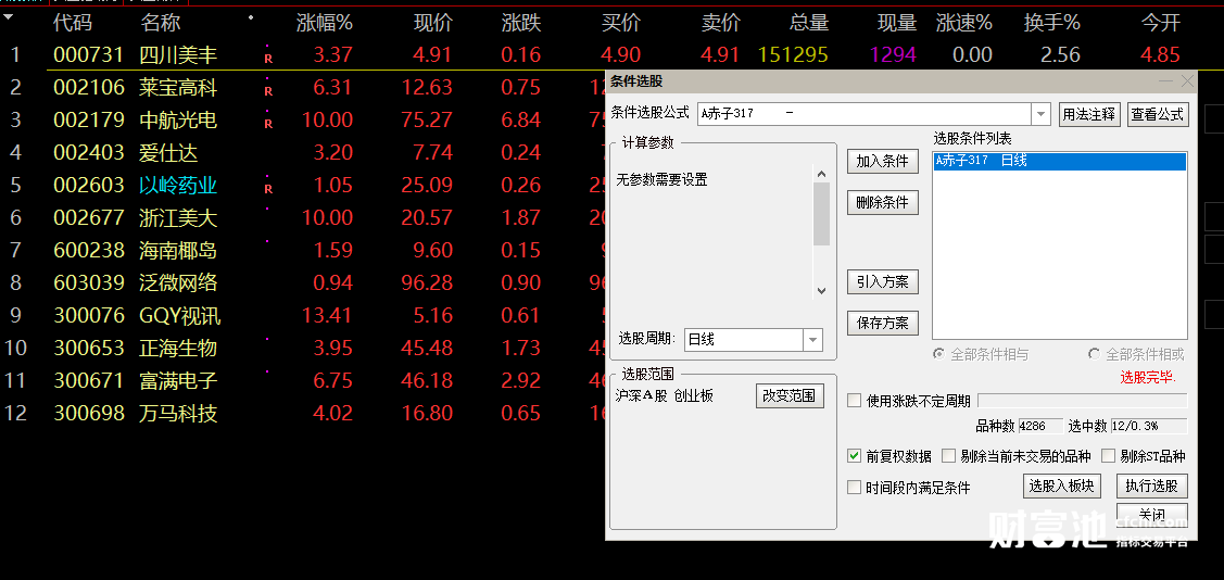 财富池指标公式网(www.cfchi.com)提醒您:指标公式是通过数学逻辑角度编写而来,仅是股票分析环节中的一个辅助工具,对股票选股效率和分析便捷上起到一定的作用,股市是具有不确定性和不可预测性的,请正常对待和使用指标公式!