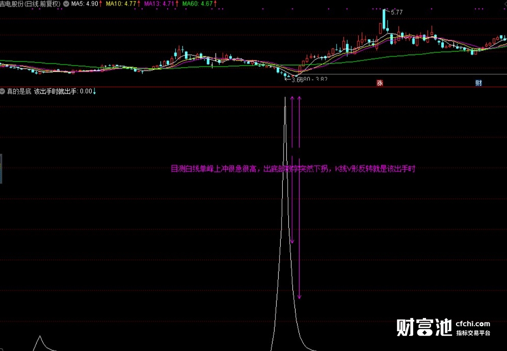 由底部主力资金变异而来的一个指标,精准到令人惊叹的地步,当白色线大于零,从零轴上拔地而起时,就表明有主力资金在打这只股票的主意,打压式吸筹建仓,白色线冲起的角度越陡,目测看起来冲得越高,波折越多,越表明有庄家主力资金在此处投入的本钱越多越大,后市上涨的可能、上涨的力道、上涨的高度越大,至于什么时候介入,可以结合自己的操盘经验,或结合最常见的操盘指标,如通达信自带的均线、MACD、KDJ等综合判断,比如均线,当指标白色线下拐或向下接近零轴,而主图中的均线五日均线上拐,或五日线上穿十日线。。。正所谓该出手时就出手。。。