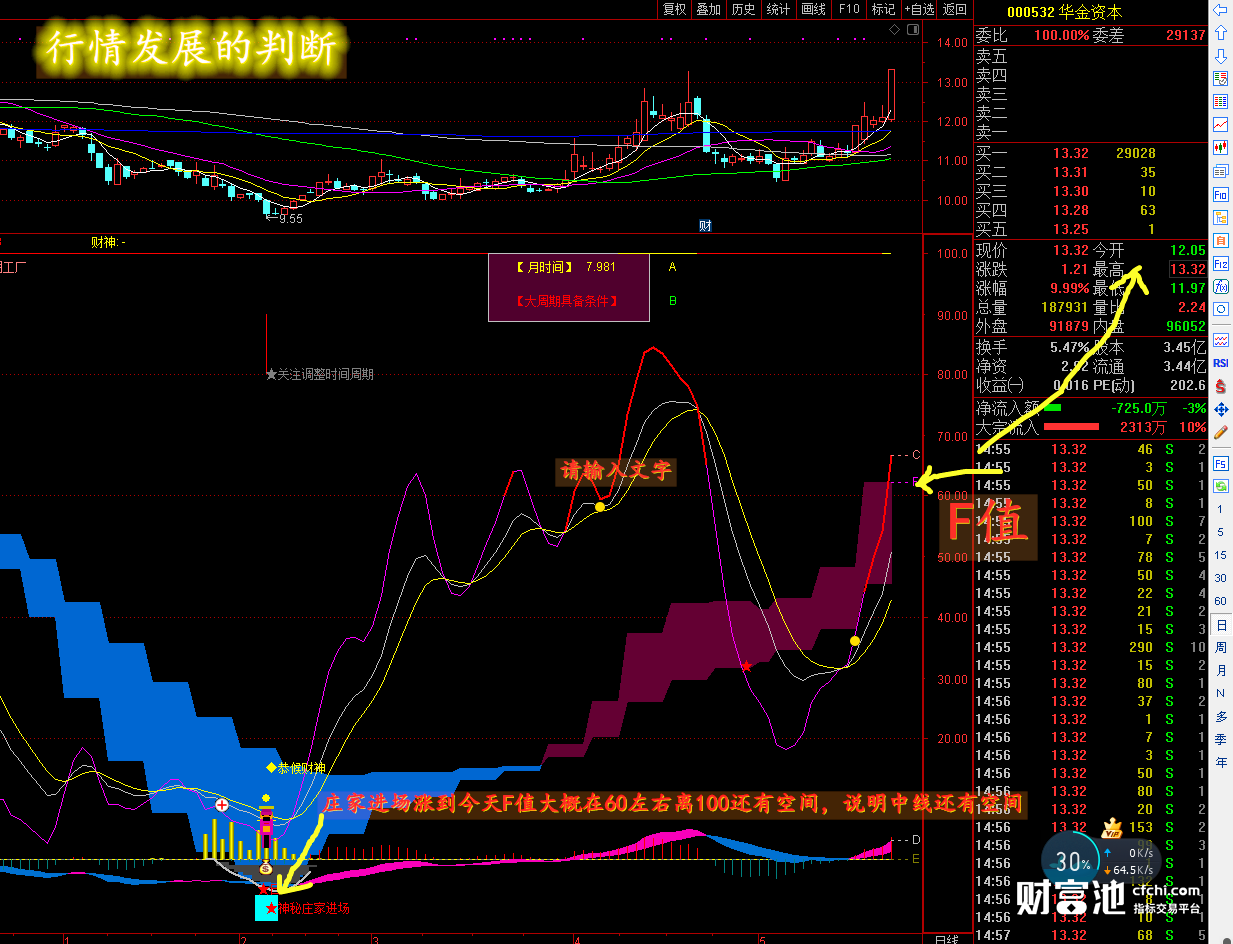 F-------周庄家,这个代表周庄家值的高低,以及死叉金叉情况,金叉上涨,死叉跌,特别要关注高位死叉,以及低位金叉的情况。