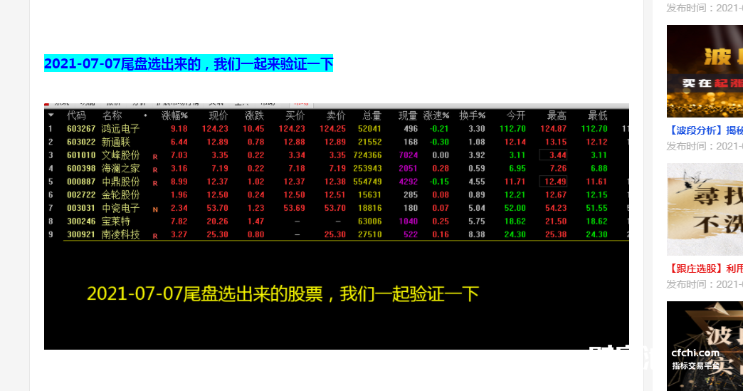 这个是我2021-07-07日在一阳天指标发布的验证股,我今天在用这个资金的指标来验证一遍: