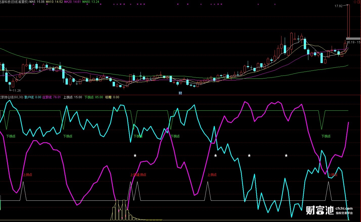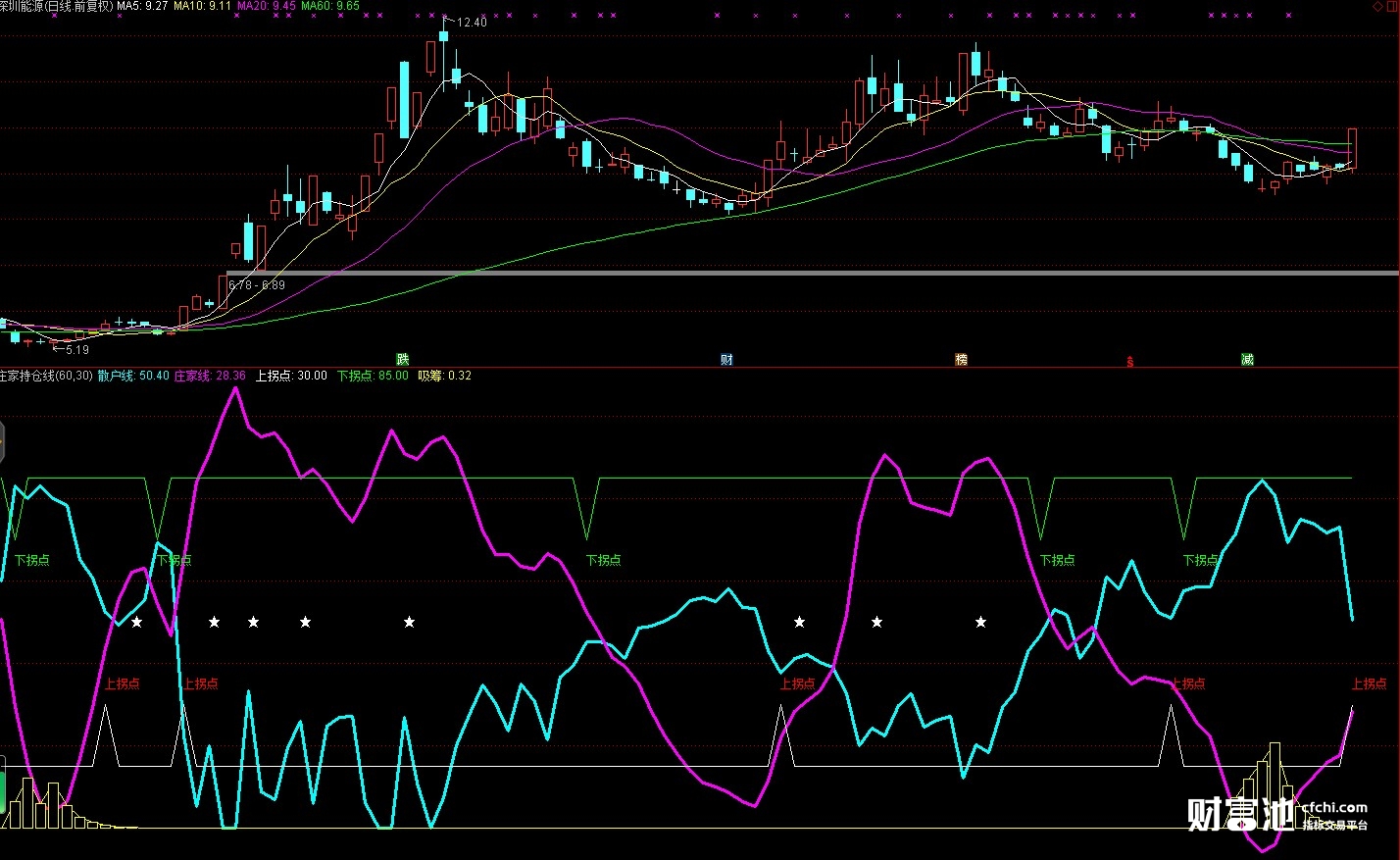 指标中上拐点提示为波段买点,下拐点提示一般为波段卖点;庄家线下穿底部筹码再上穿而出时为低买或抄底最佳时机;庄家线与散户线金叉时是强势短线或波段买点,相反死叉时可作为短线或波段减仓点,看具体情况具体分析判断;指标中白色星号是短线减仓信号,有经验胆大的操作者,可在趋势和K线未破重要均线,下拐点信号未发出前逆向思维看着另一种买点,指标只能做机械化提示,具体操作决断要看操作者的经验与智慧了。。。