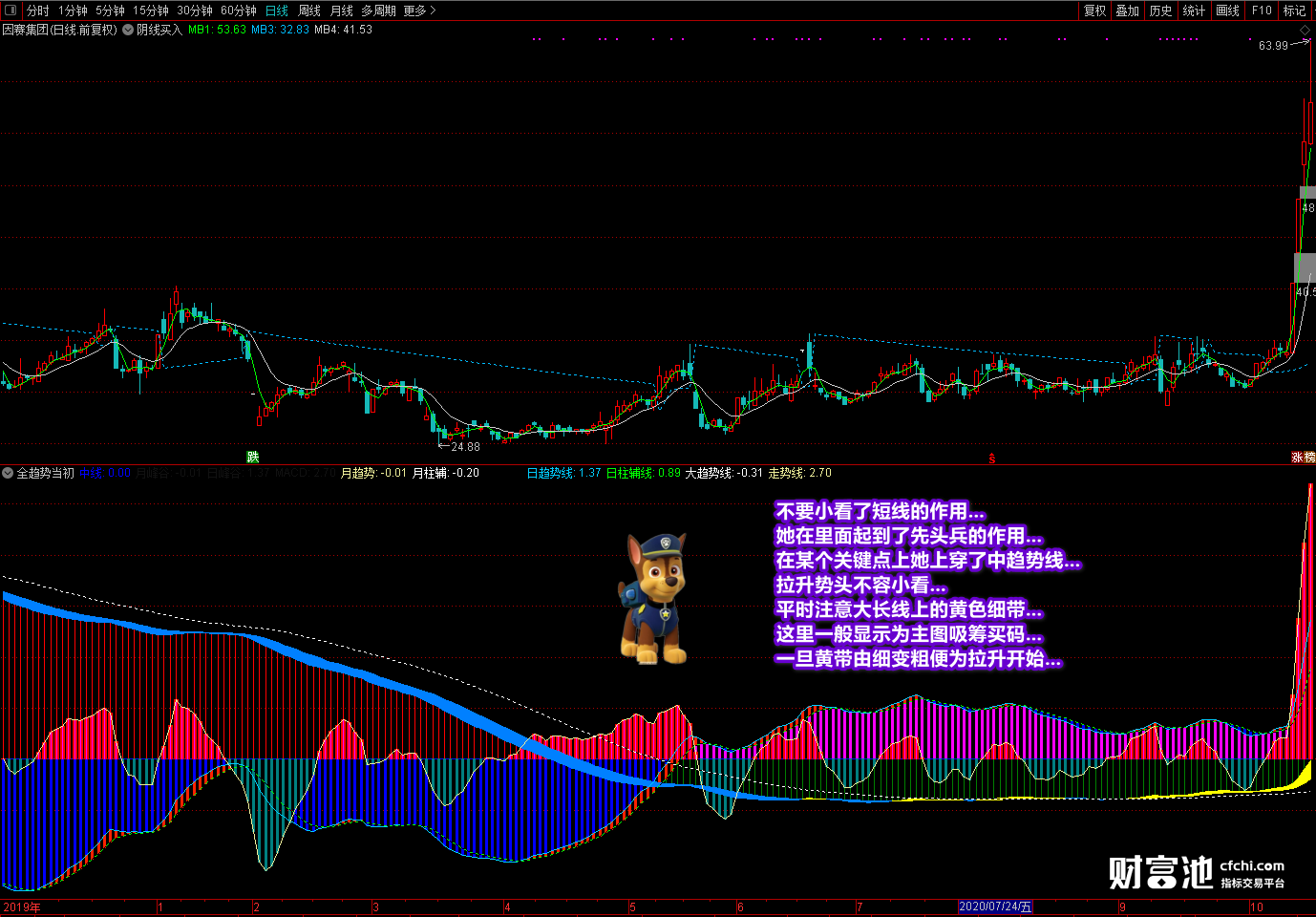 这指标如果你用的好,可以说天天是牛市。你可通过这指标直观的视觉轻意找到正在处于上升或拉升中的个股,并且可以在做完这支个股的上升趋势后,再去寻找下一支正在出现上升趋势的个股,总之看着这指标做不会让你亏损。有什么不明白之处请同学们随时提出。原创不易,回复留香....