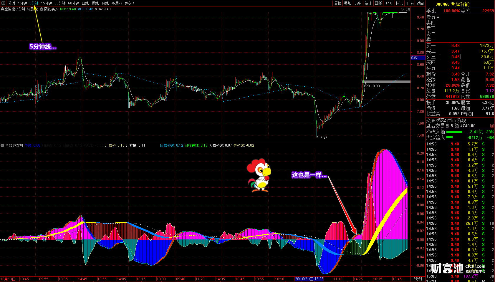 订阅了的同学可以看到A股大盘的牛市形成过程,通过此指标你会发现牛市离我们有多远,目前我们的大盘处在一个什么地步,再通过60分钟或5分钟线知道大盘明天涨还是跌,什么时候该清仓休息,什么时候该去收割,甚至通过1分钟线明确做T,比看分时图还要明快......