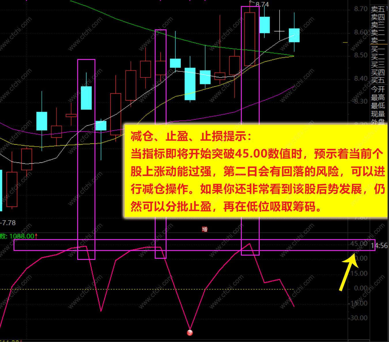 当指标即将突破45.00数值线掉后向下,快到或者已经突破0轴黄线时,预示个股开始呈下跌趋势,这时我们要学会分批止损,避免大额亏损。