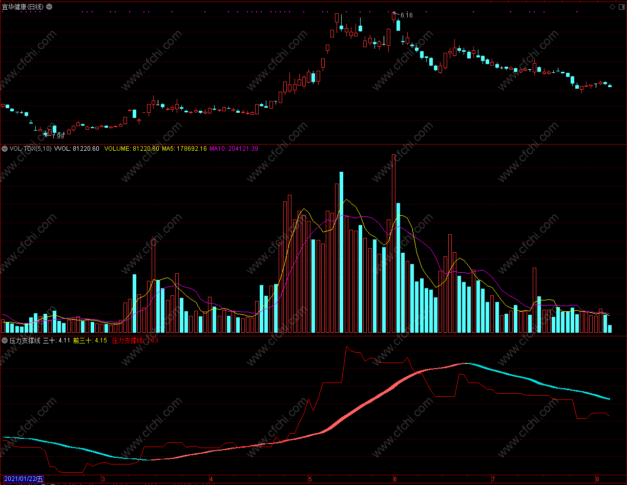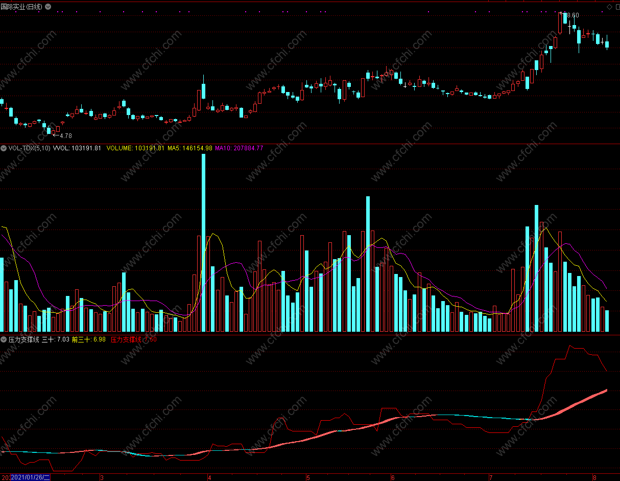 白线金叉黄线时买入 通达信压力支撑线副图指标 免费源码