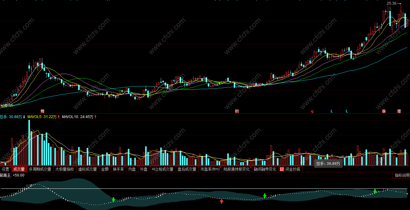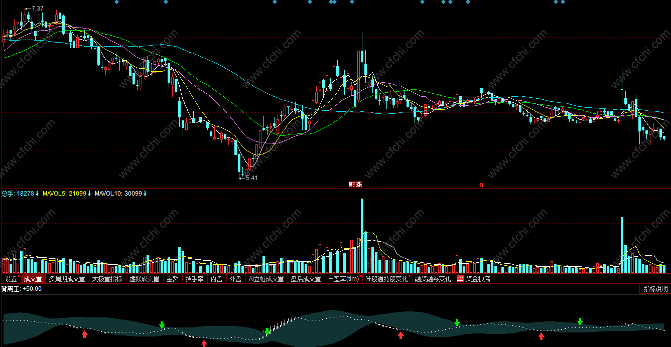 该指标由弘历背离王指标改写而成,出现红箭头为买入信号,出现绿箭头为卖出信号。