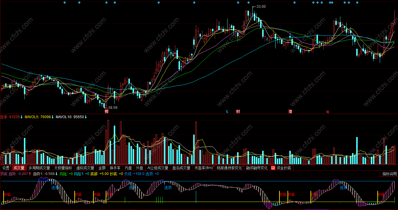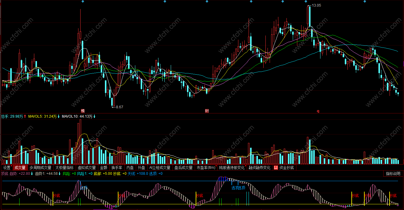 黄色柱线为抄底信号,出线黄色柱线同时个股走势出现企稳攀升态势,可以尝试性买入。