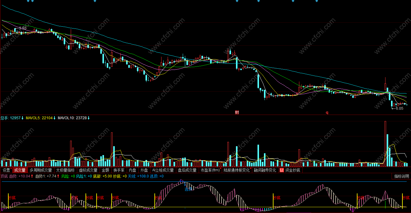抄底: IF(CROSS(趋势,底部),60,0),LINETHICK2,STICK,COLOR00FFFF;