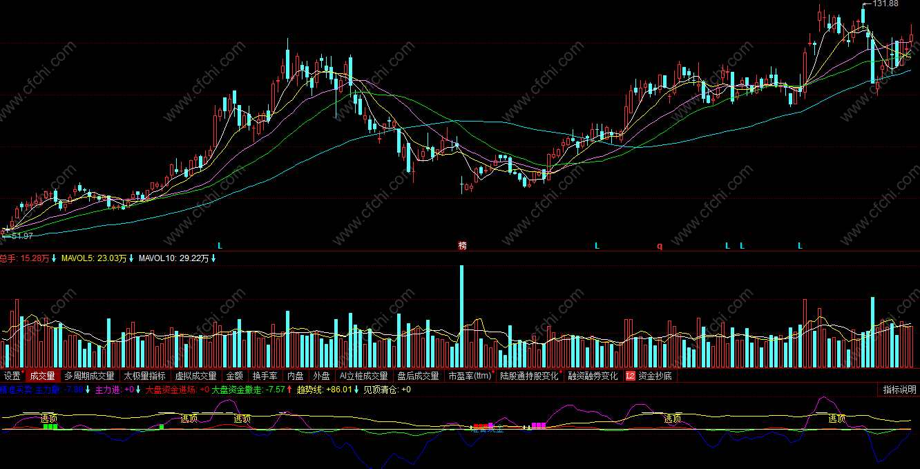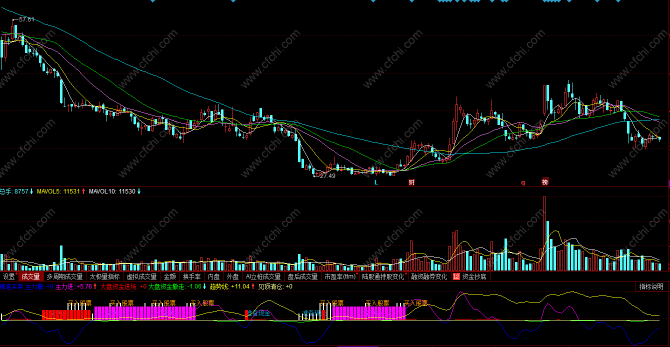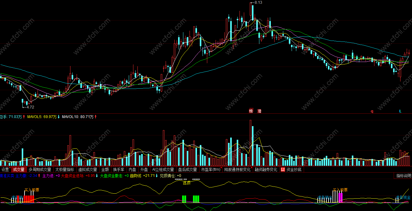 使用说明:根据指标图形中的相关文字提示作为买卖信号,粉丝柱状图表示主力进场建仓。