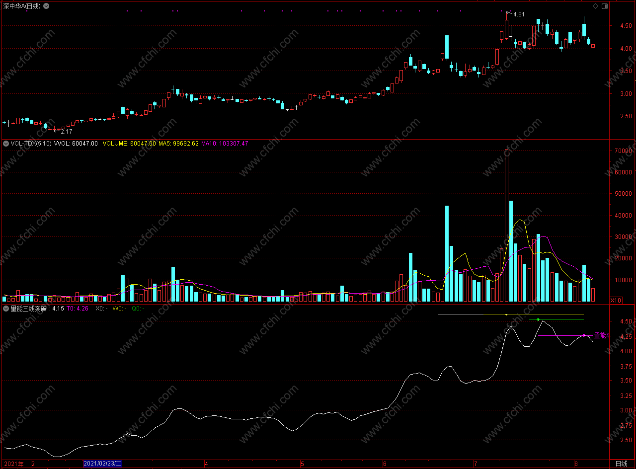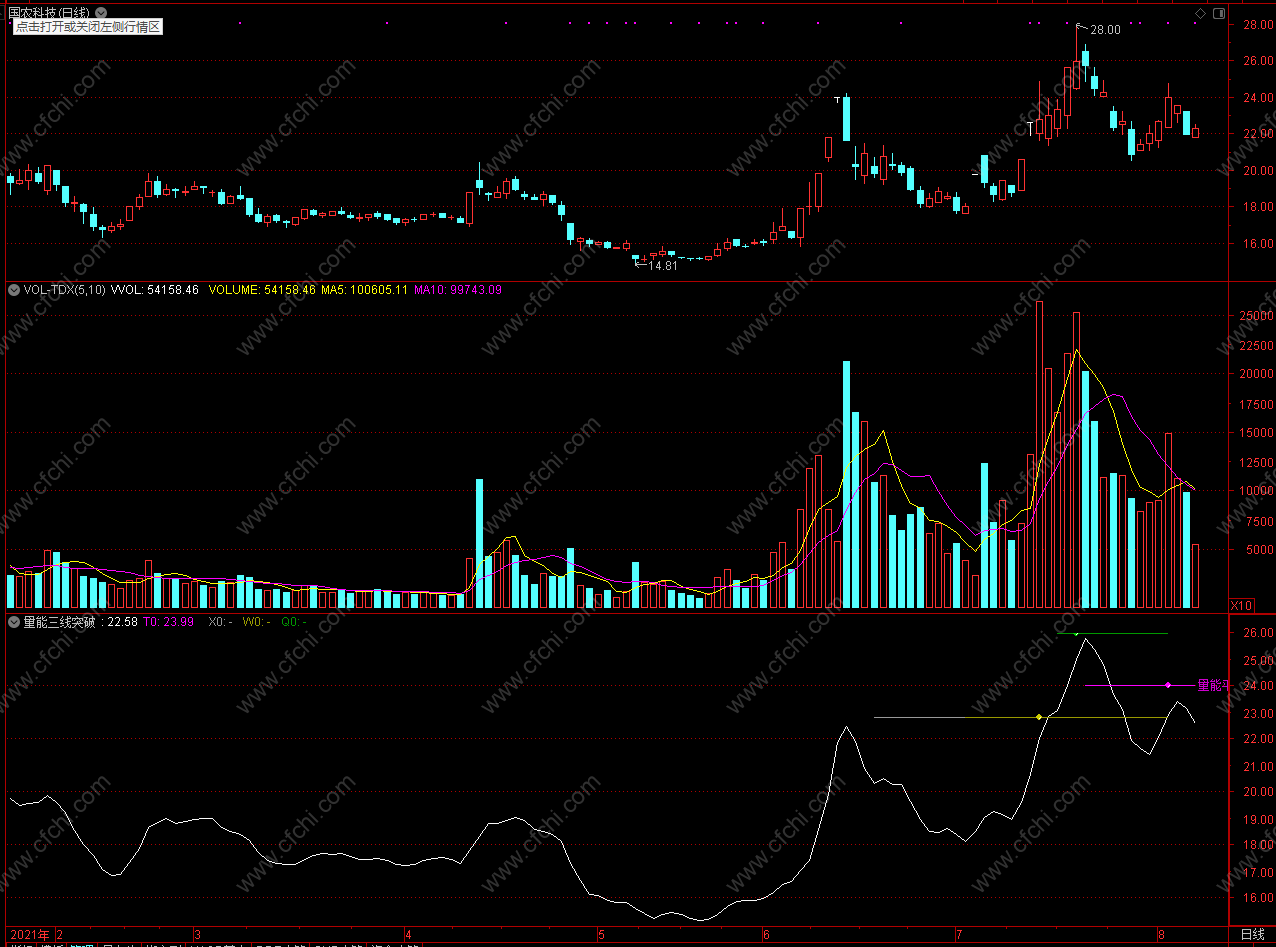 (叠加K线 通达信量能三线突破 副图 无未来 源码)