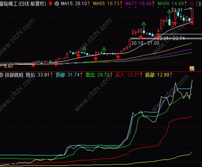 诠释: 当按部就班指标白色现价线由黄颜色底部线向上上穿底部线,表明个股或者指数极有可能创出阶段性的底部,转而开始向上,操作上可以介入持股;倘若随后白色现价线拐头向下回落至底部线处后立即拐头向上,或者现价线拐头向下击穿底部线,随后又立即拐头向上再度上穿至底部线上方,此为阶段性底部信号的再度确立,买入信号相对更强。