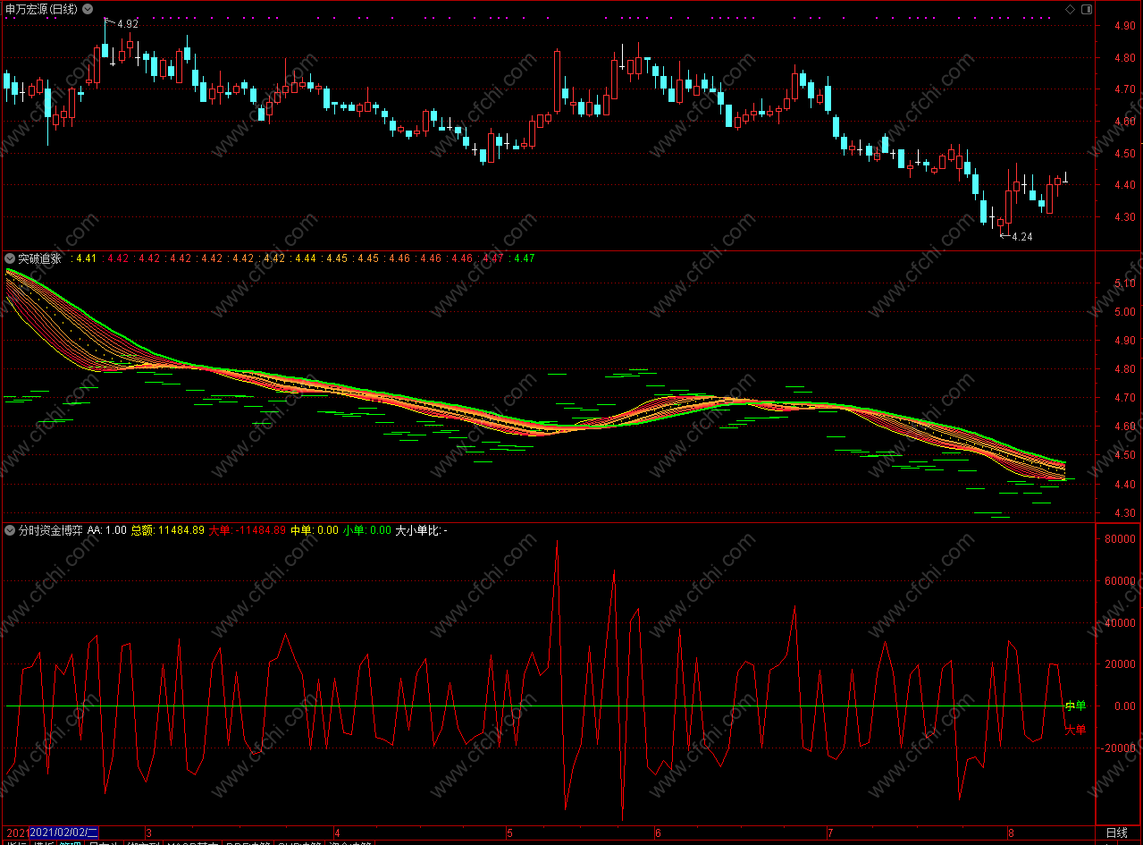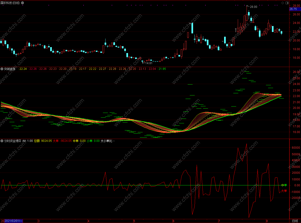 大单资金上穿中单资金买入 通达信分时资金博弈指标公式 副图 源码