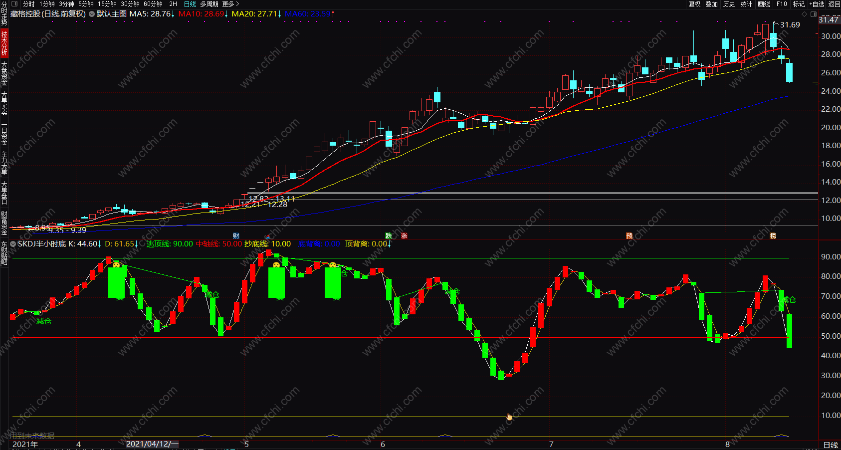 DRAWTEXT(顶背离>0,D-5,'减仓'),COLORGREEN;