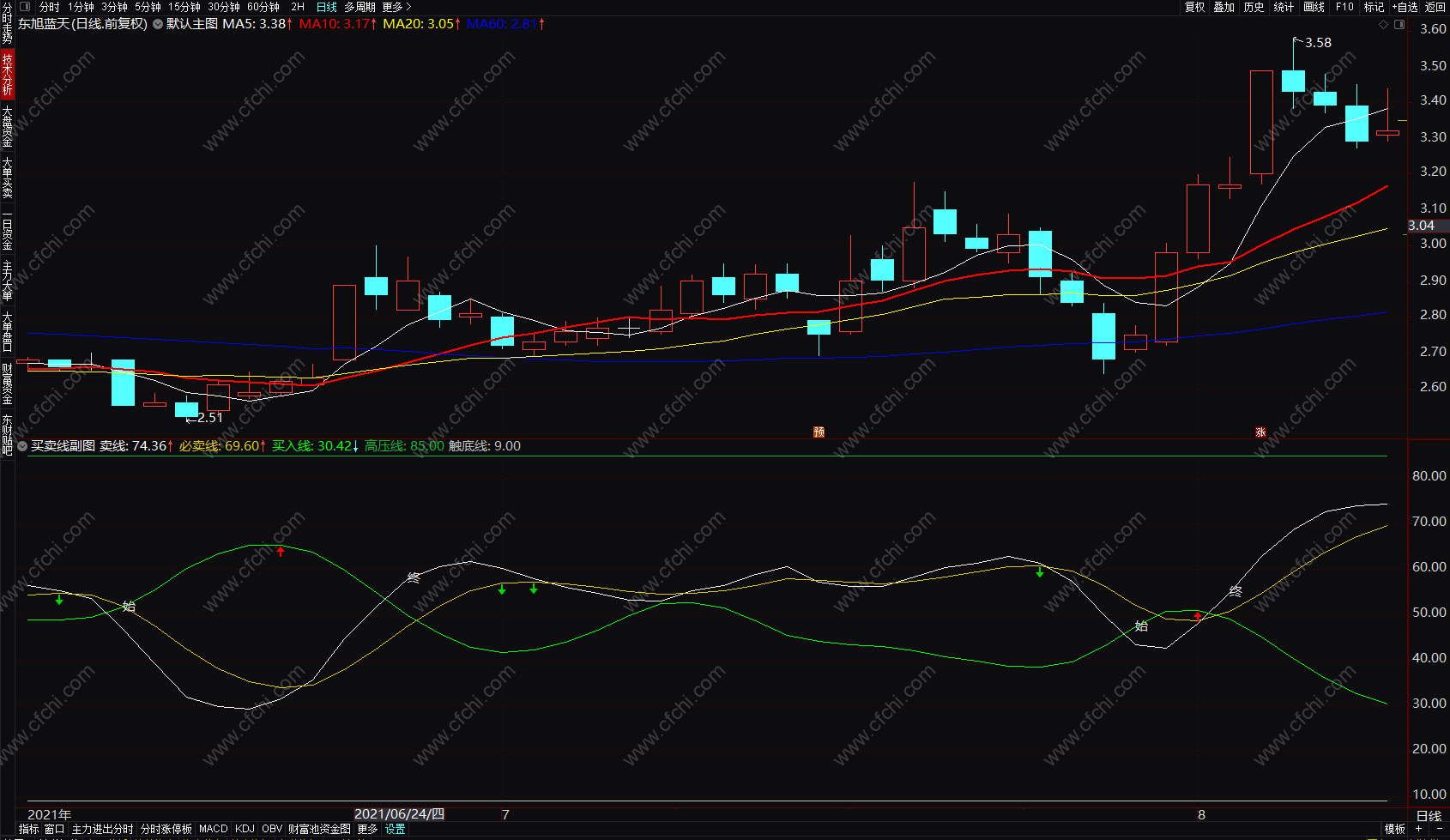 指标采用了类似KDJ的算法,黄线和红线为一组,绿线为一组,指标带提示效果。