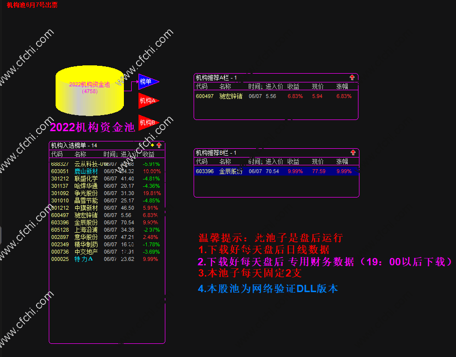 功能介绍:此款股池是一款专用于分析 盘后个股上龙虎榜单资金个股 上榜个股资金排名专用股池工具 会自动筛选出 上榜机构个股资金流入排名最强前2名的 个股 进行推荐计算