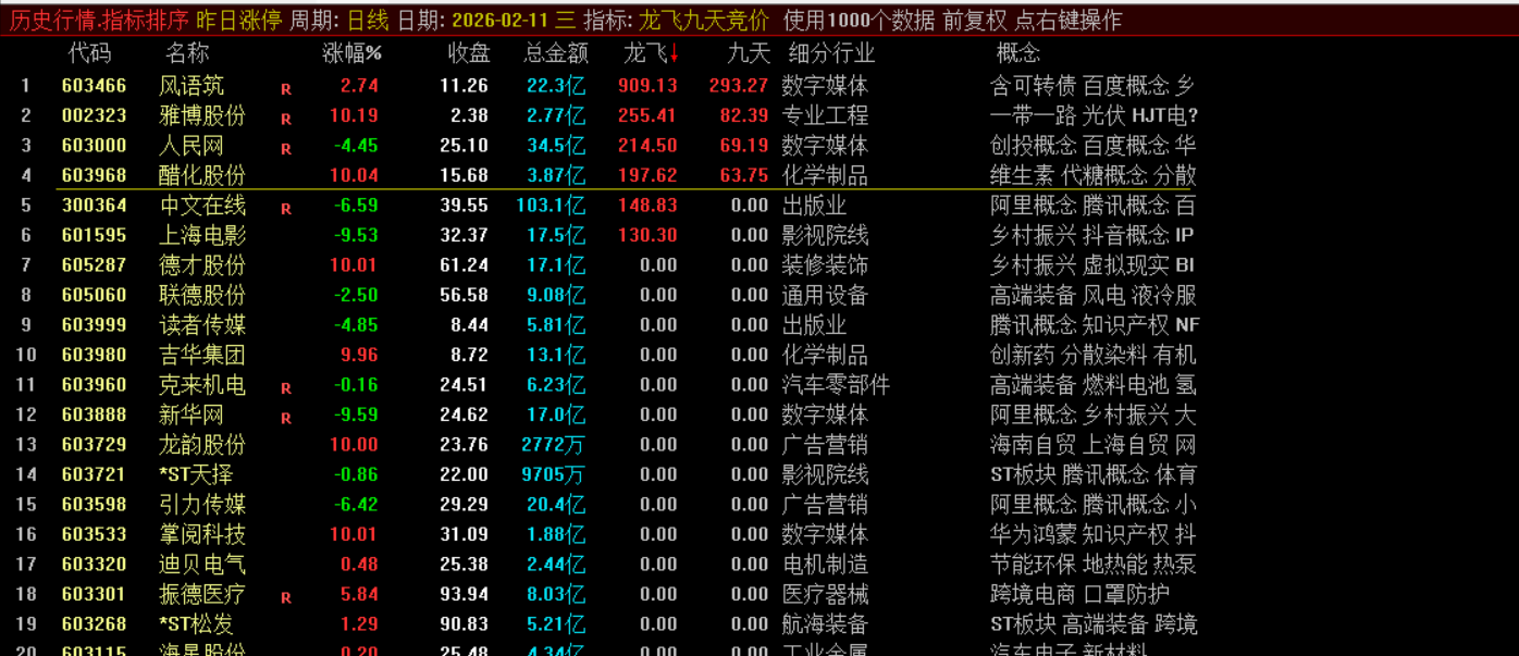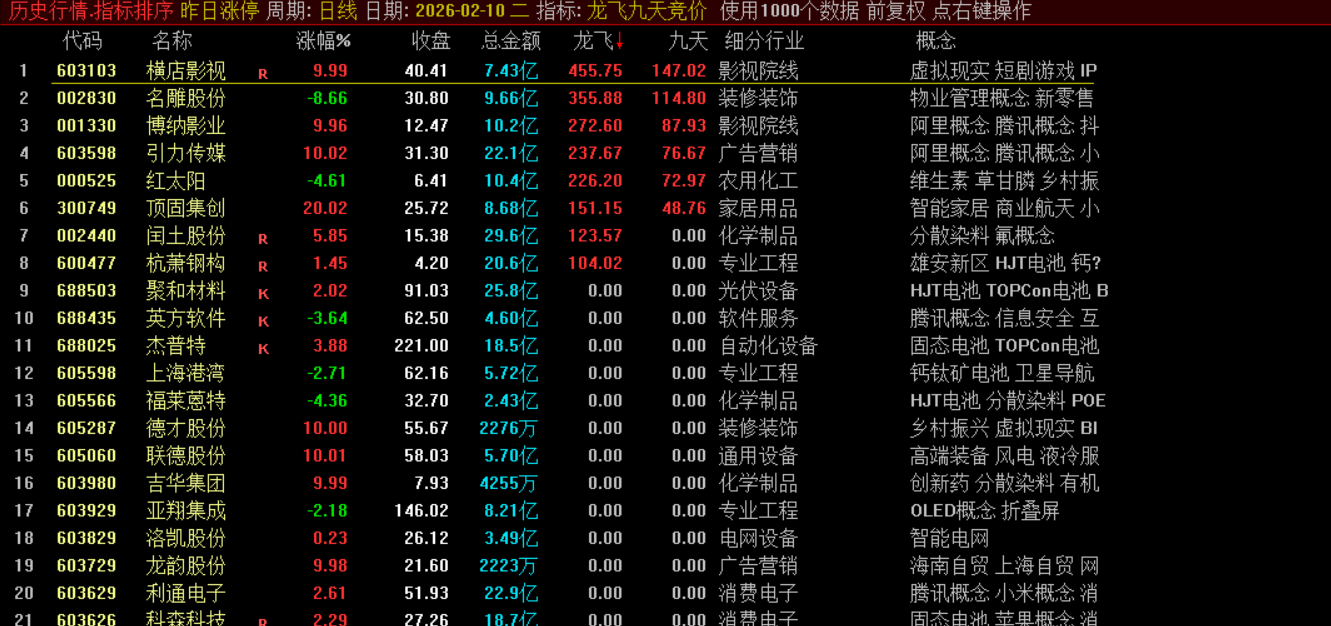 它综合考量个股的安全评分、近期是否连续涨停、开盘涨幅、前一日是否为一字涨停等因素,并结合资金面和流通股本数据,计算出一个“龙飞”动能值。