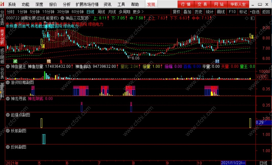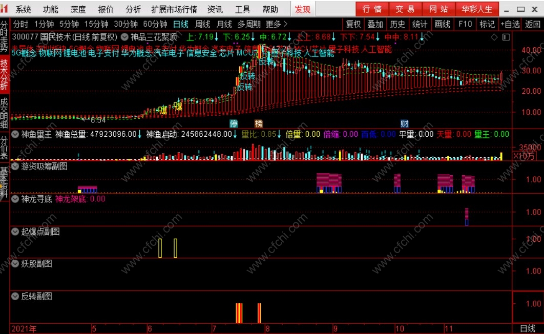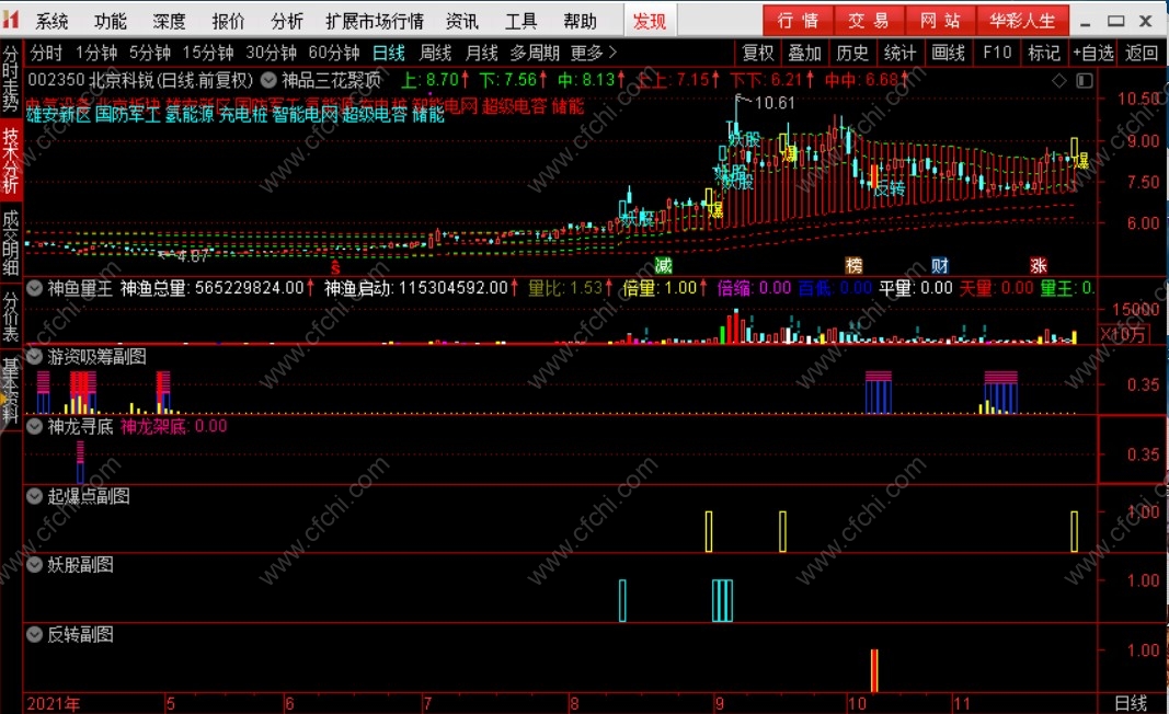 神鱼量王副图中的白色虚线为题材股,小盘股操作性的及格线,量能过此线必有或长或短的行情,百日地量,倍缩量尤其是倍量、天