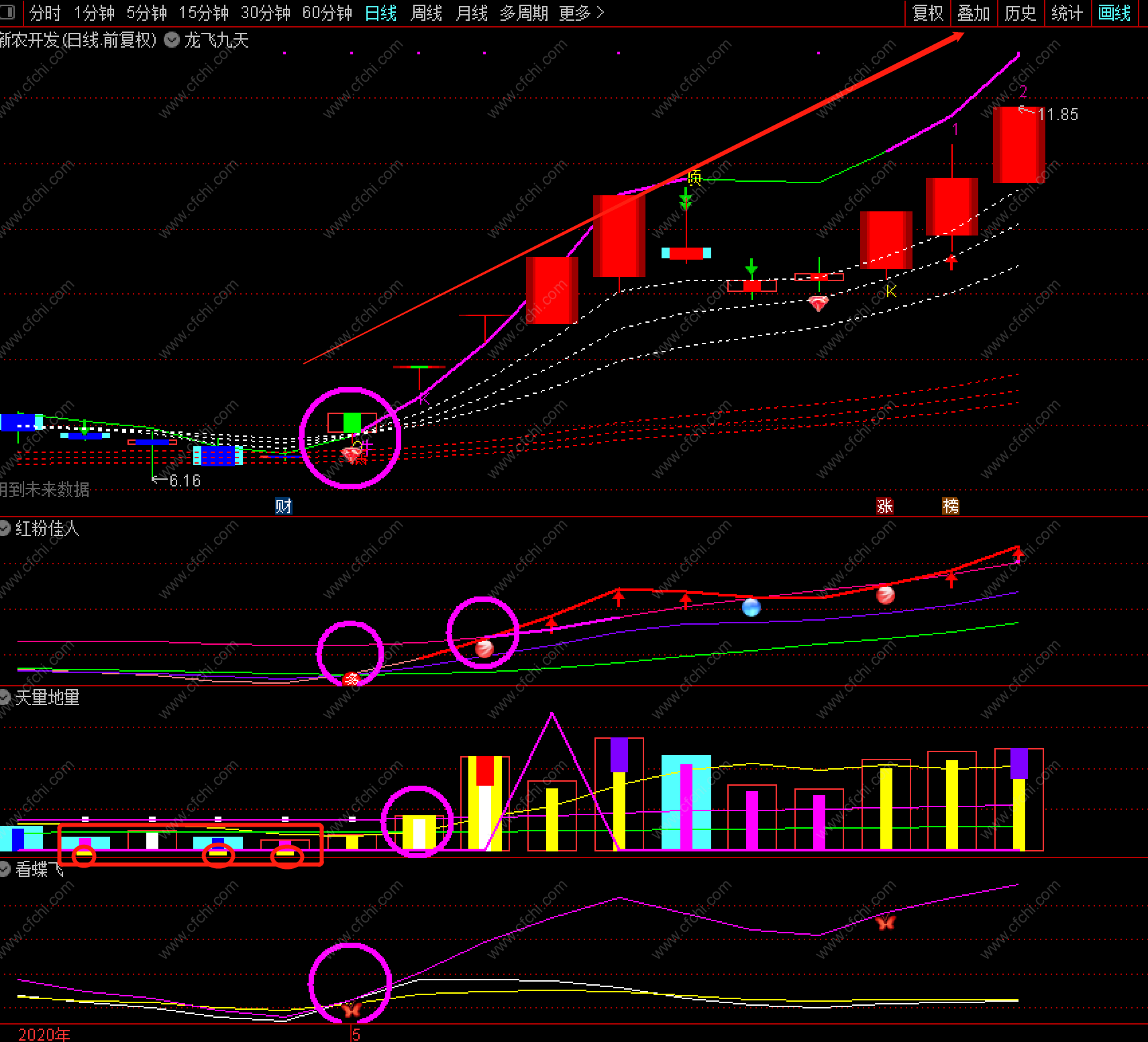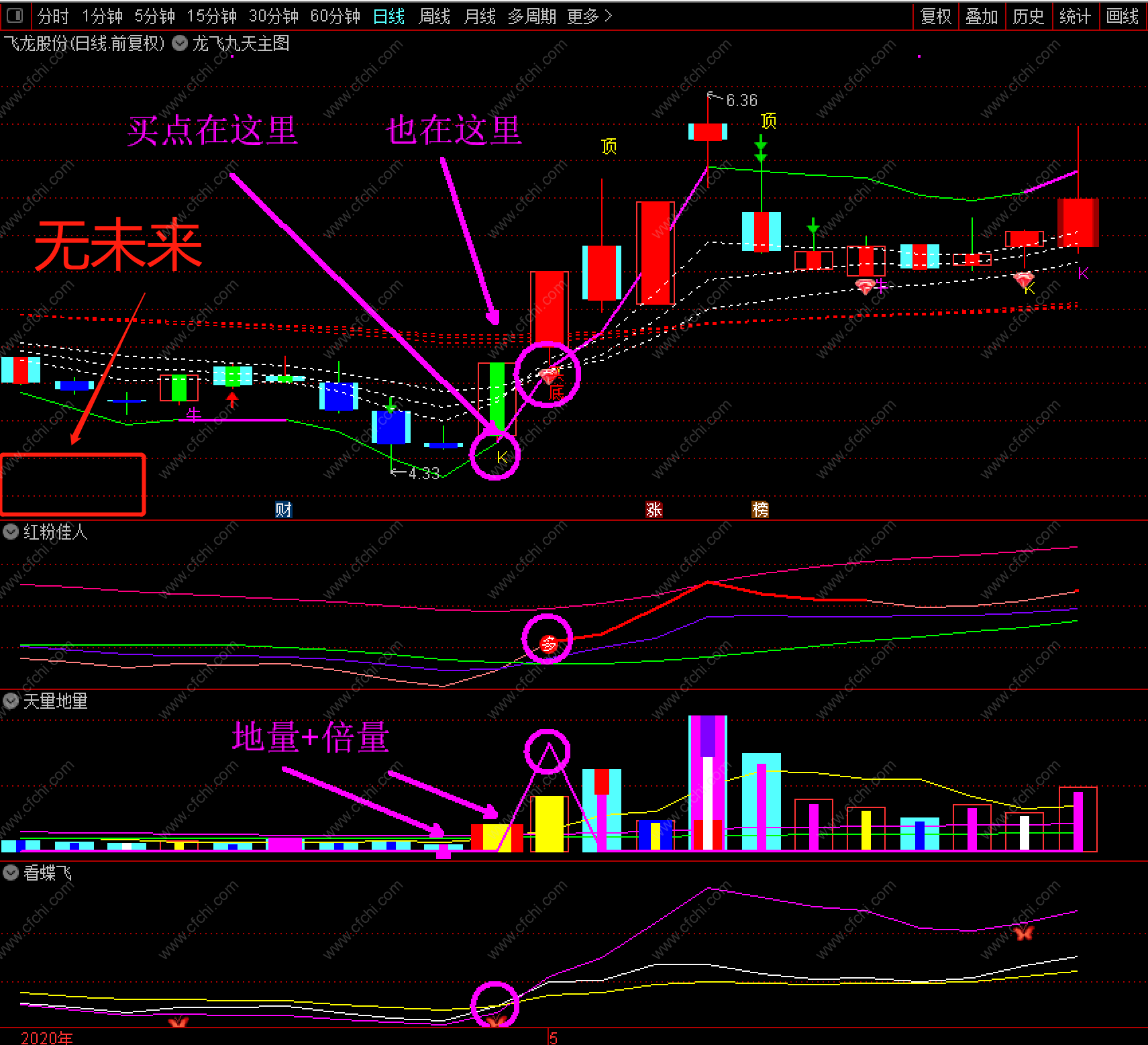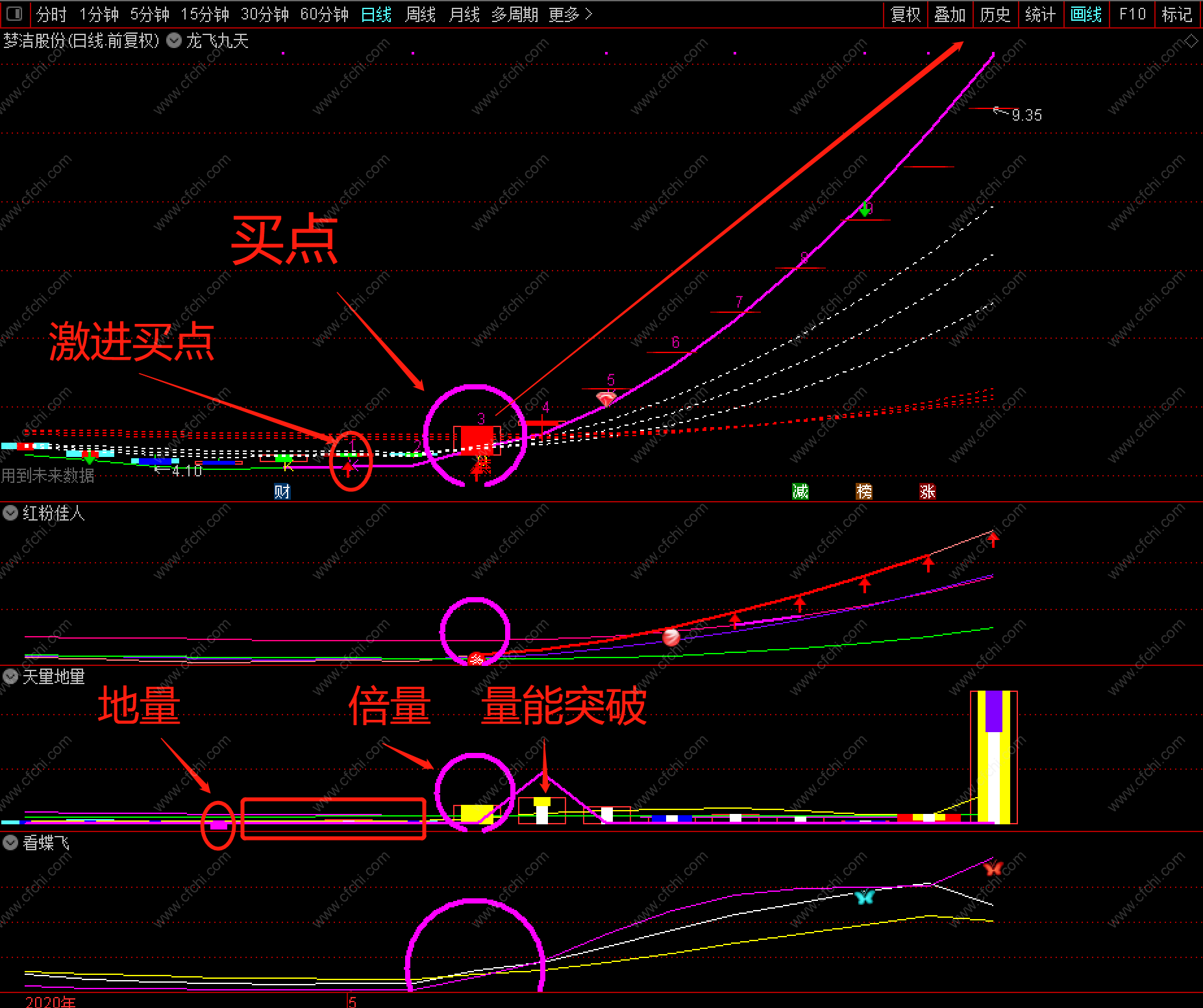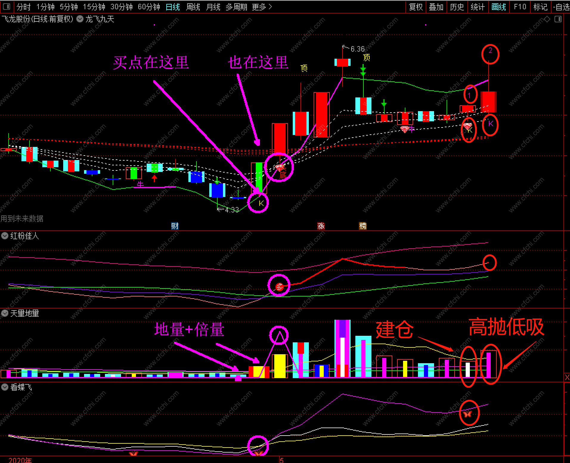 【龙飞九天】指标套装由龙飞九天主图和红粉佳人+天量地量+看蝶飞三个副图以及一个龙飞九天选股器构成。几乎打尽一切牛股妖股龙头股!