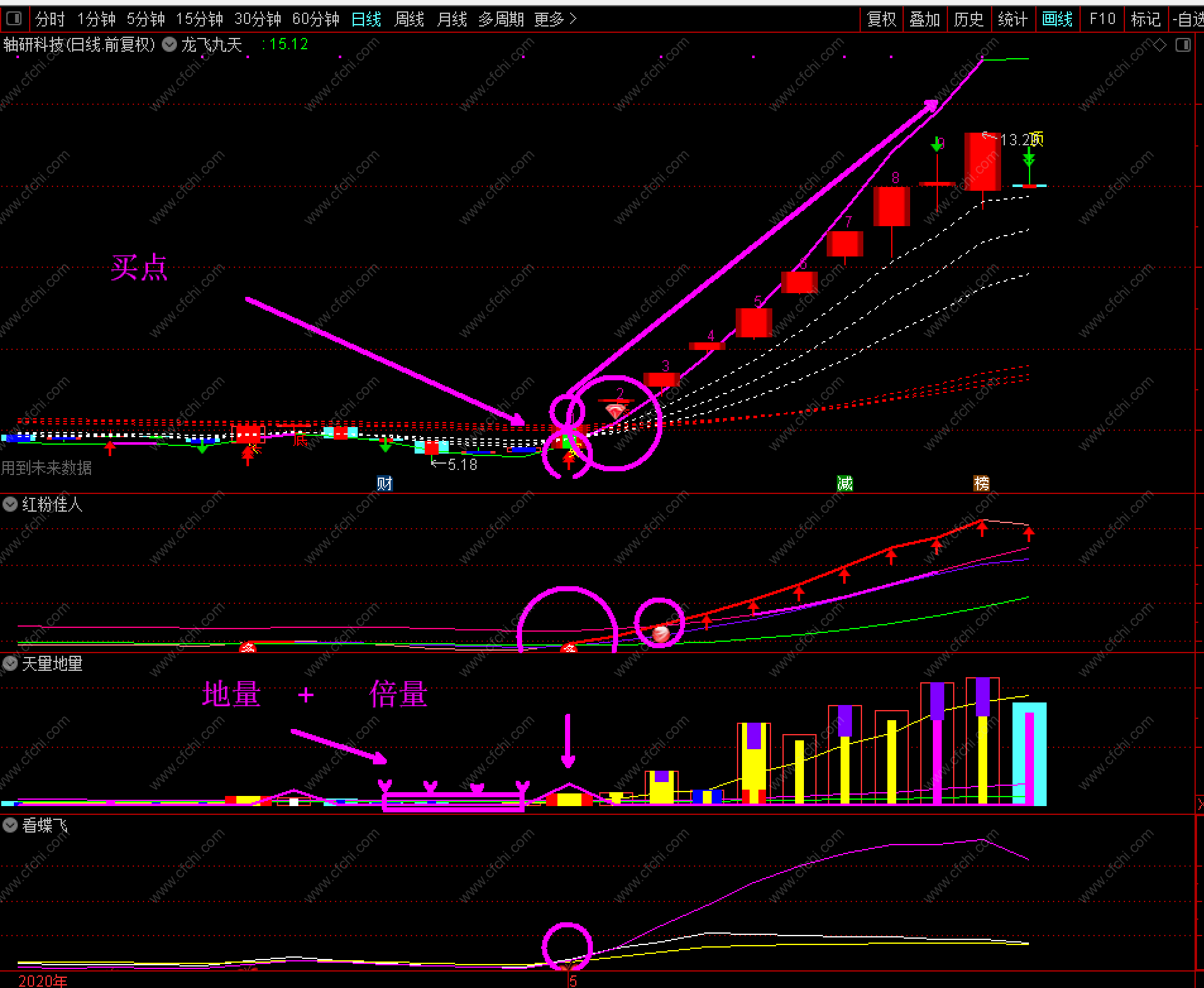 2.通过各项常用指标的金叉及多条多倍均线的关系来确保上升趋。