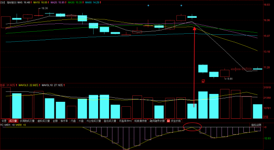如下图所示,这是一个抄底公式,当粉色的柱子达到最高值的时候,证明抄底的时机要来了,这时候可以趁机买入,因为之后的股价会慢慢上涨