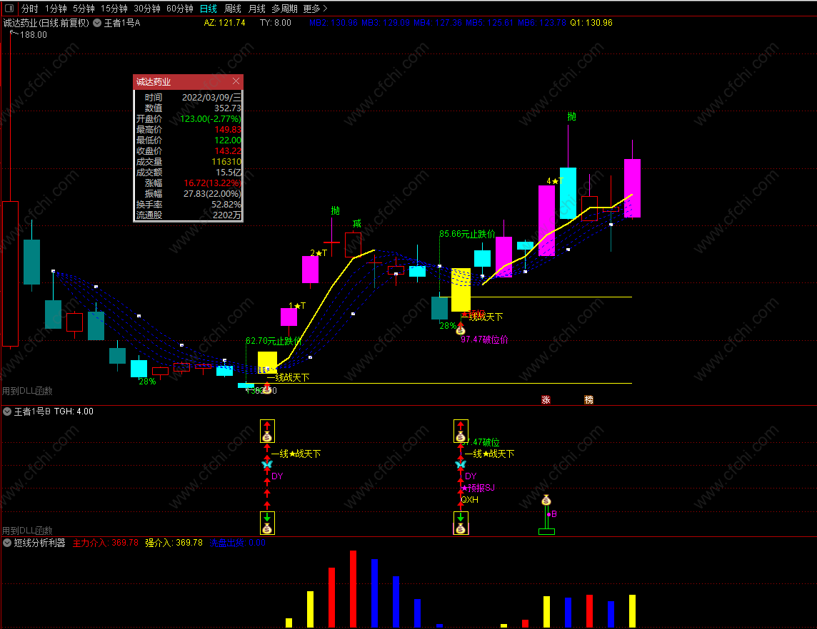答:本指标是一款组合升级版指标 由:2022一线战天下+2022预报涨停+止跌价+趋势多空 这是一款以主力强势连续洗盘结束后 自动画线一条洗盘结束平衡线 捕捉个股主力反转止跌点 预报个股短期内大涨幅爆利拉伸思路设计组合类型指标