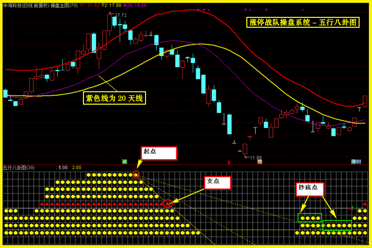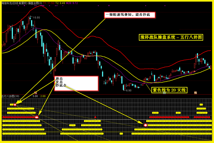 3、之前图上您介绍了阻速线在五行八卦图上找抄底点位,这个位置主图黄线、20日均线还处于下行状态,红线走平状态,这种情况下是否可以建仓?或者说按照您新出的操盘系统,比较稳妥的建仓点是哪里?是要在操盘区的黄点亮的时候吗?清仓点是在操盘区无黄点的时候吗?