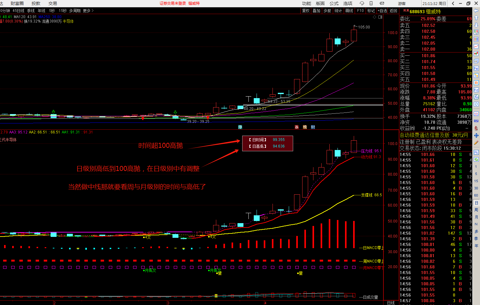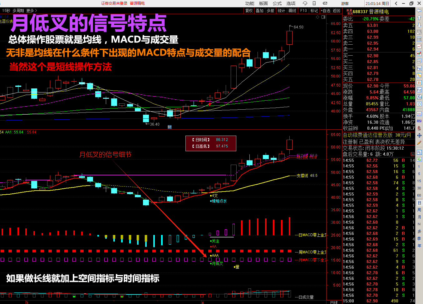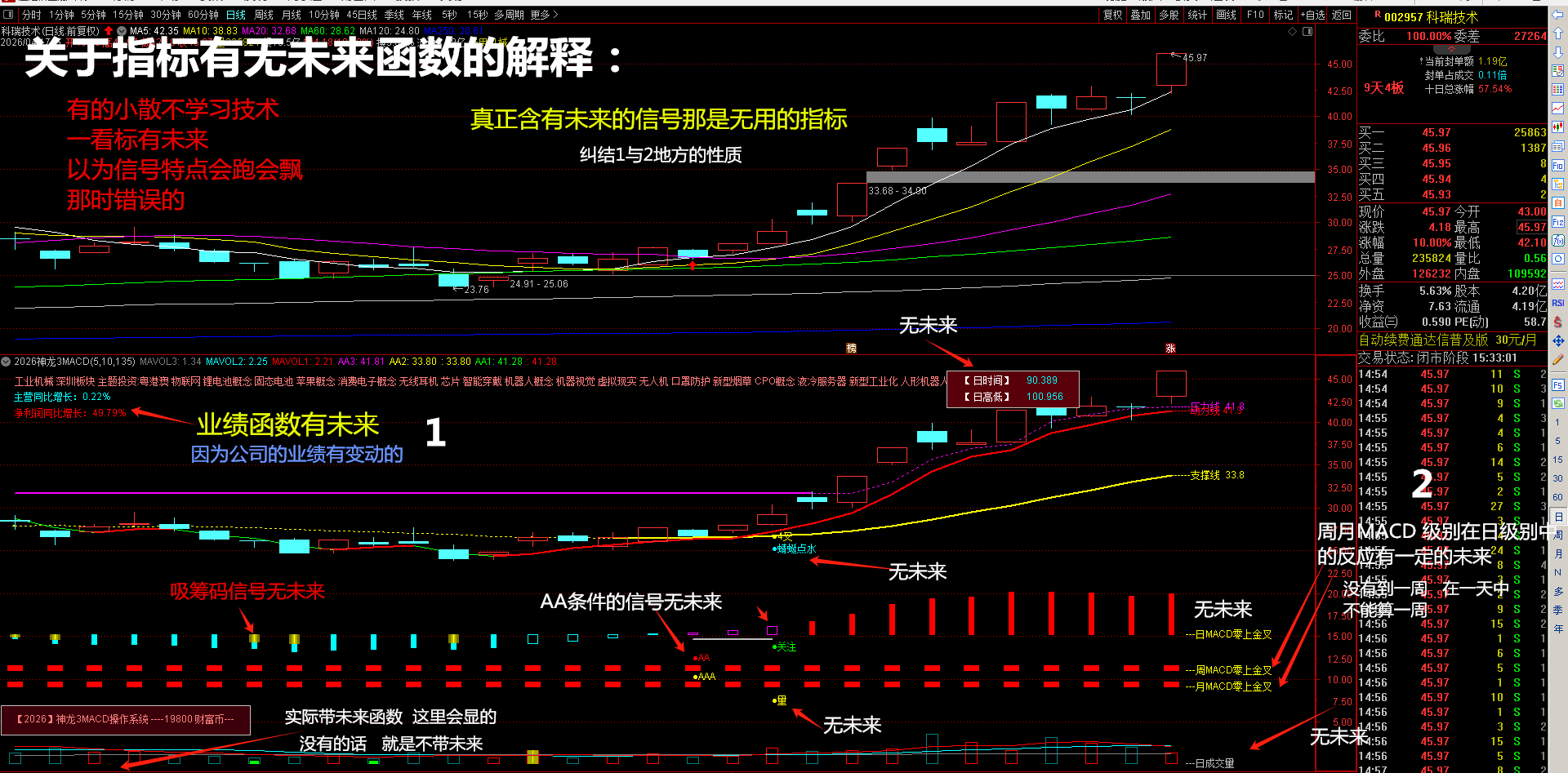 为什么指标中加了未来函数?当然不加也行,但当我们在选择股票时,指标表面就能发现公司的业绩 这样选择时间短,碰到烂公司我们马上绕道。周月MACD函数的精髓 一定要懂,在日级别中 1天2天不能反应一周,5个交易日 才能完成一周的反应。懂了这个道理。你还会怪未来吗。如果操作信号带未来函数 那么 指标中的信号会飘移,这样就对操作有影响的。希望你懂,在这个方面我们就不化时间,再讲了。