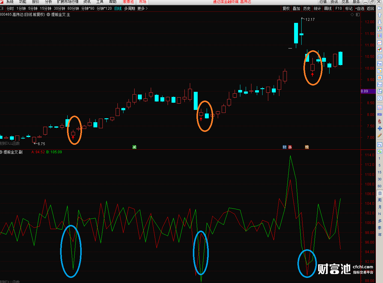 【提前金叉】提供了两种信号:红箭头信号为常规互逆信号,属于宽松类;红十字信号属于标准信号。所有信号选股或预警后均需符合跌幅较大原则,即跌幅越大的信号越优先考虑。