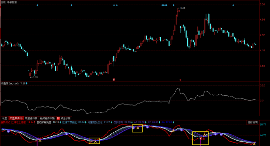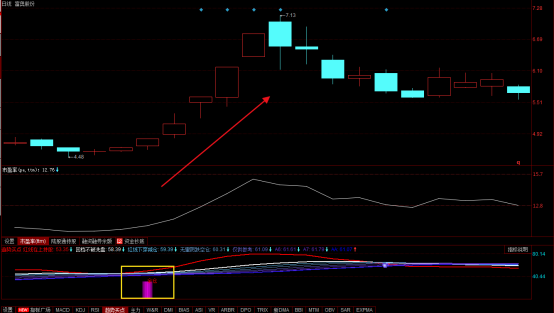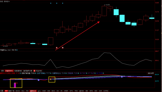 有点像均线瀑布,当红色线上穿白色线是买入信号。在低位的信号要稳妥些。如果此时同事出现紫色柱子,发出全仓的问题提示为共振。