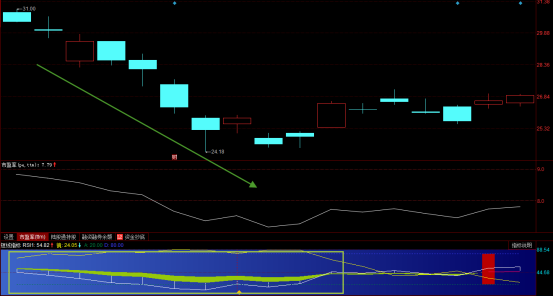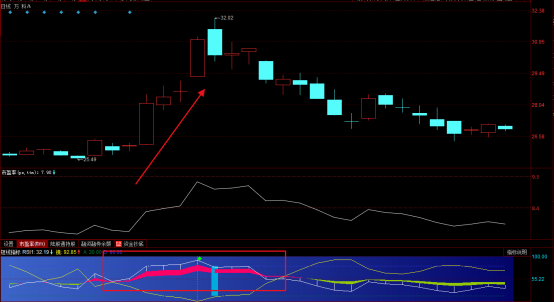 红色彩带出现,是看涨信号,而当蓝色实心柱出现时,这是一个分割点,预示股价上升到达峰值,接下来的趋势可能会下降,股民在这时候应该要慎重入市。
