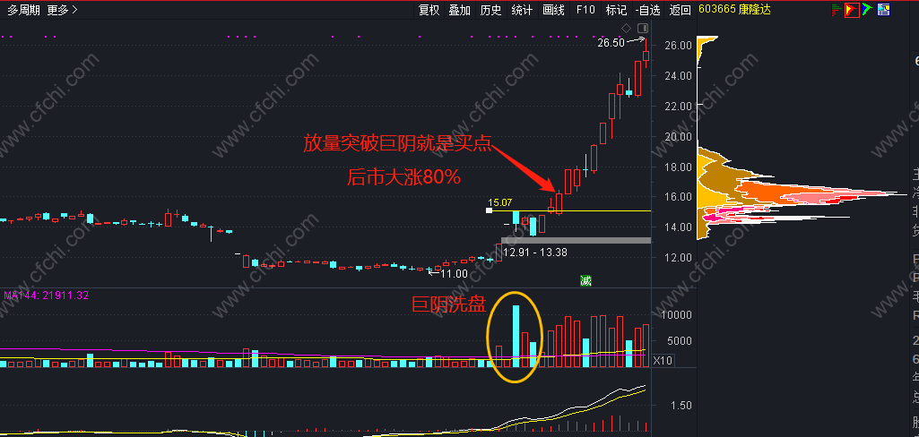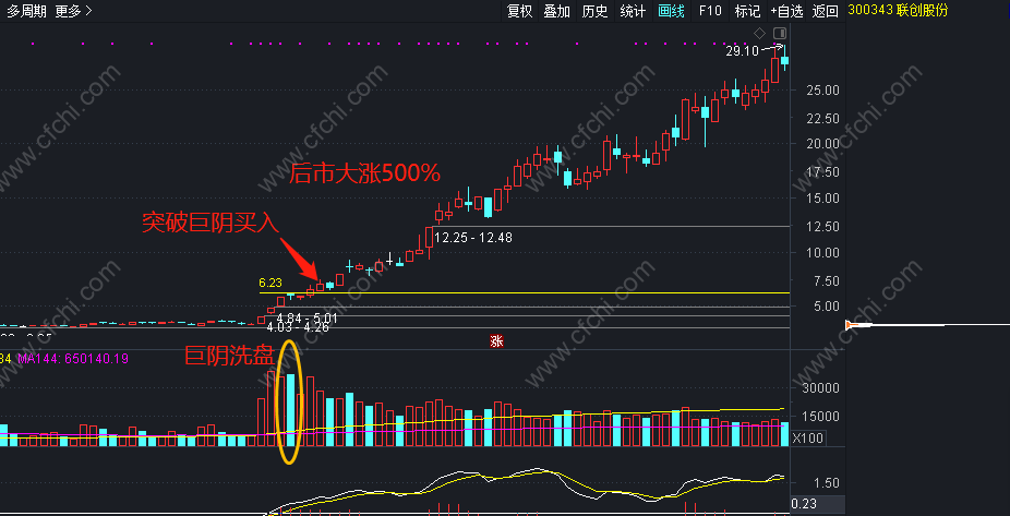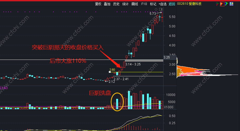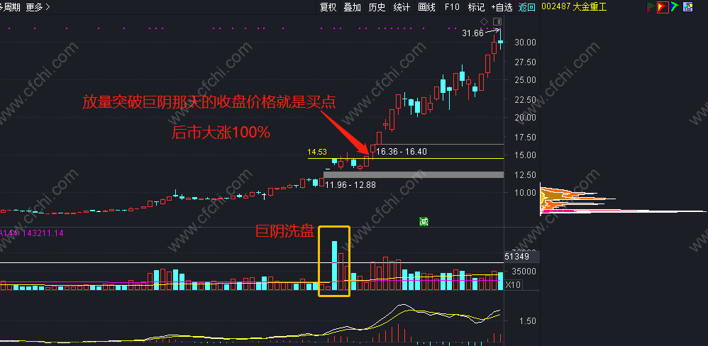 4、然后放量突破,收巨量阴线那天的价格,果断买入