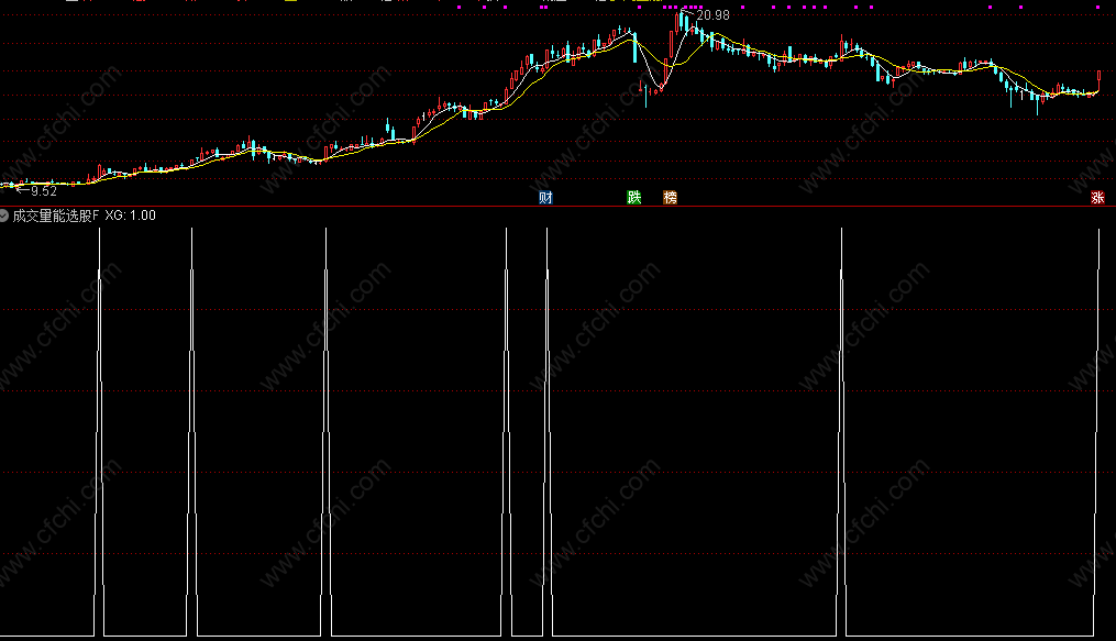 具体信号说明:指标是选股指标,利用成交量、涨幅等条件进行选股,指标可用于条件选股或是幅图。当出现信号后,可综合大盘环境其它趋势分析指标、量价关系等综合分析,寻求合适的买点介入。
