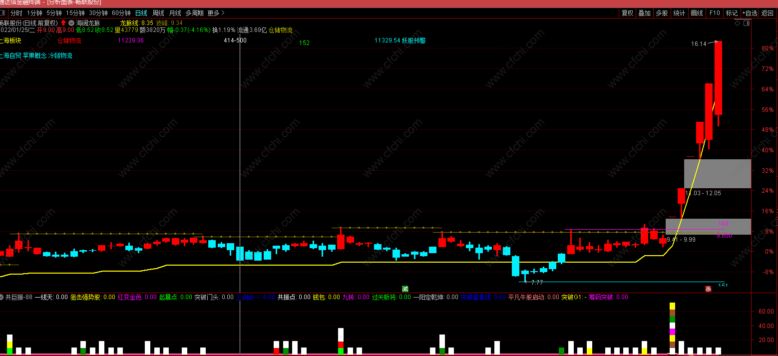 本帖包含龙脉线主图、共巨振幅图和共巨振选股指标公式。