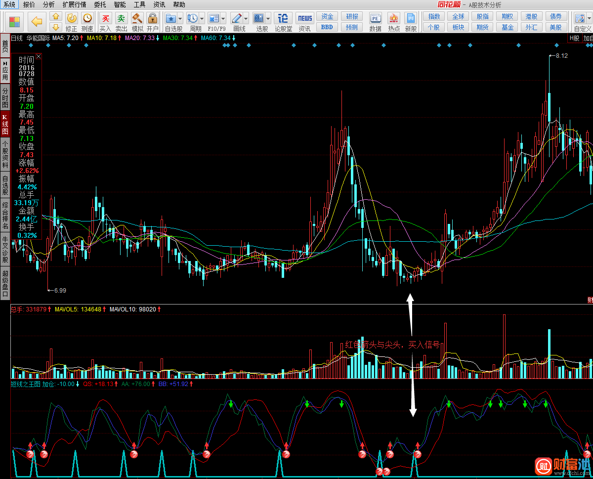 红线趋势上行,出现红箭头买入参考,出现绿箭头都是减仓或平仓的提示参考。 使用时请结合其他技术指标、成交量、大盘走势等多因素进行综合判断。