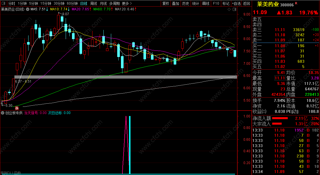 【创业板专供】指标同样也增加了排序筛选辅助指标——【创业板排序】,尾盘选股后,通达信输入.401 回车(注意401前面的点号也要输入,完整是输入.401),即可调出排序指标,调出之后立刻按键盘上面的F8刷新数据,可以连续按F8刷新以保证数据为最新行情数据,然后从大到小排序。排序指标仅仅用于排序,不用于选股。排序指标解决了指标同时选出多个选股信号的时候无所适从的烦恼,快速提升选股效率,加速决策。排序指标就是在所有符合原版指标条件的基础上进行二次筛选,属于精选范畴,精益求精。