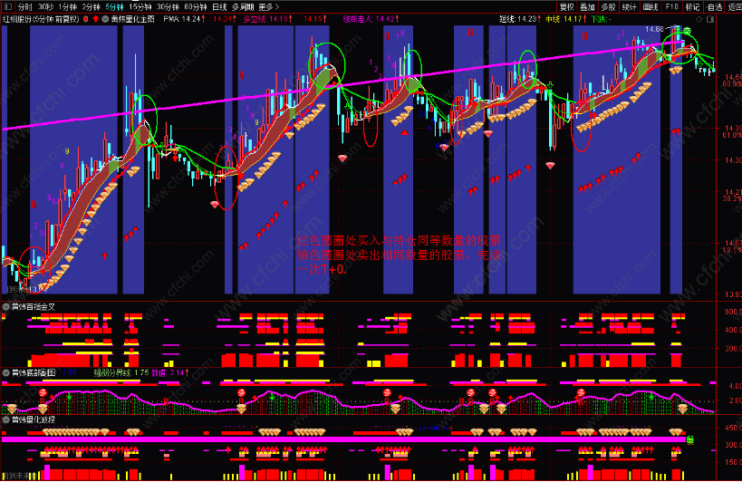 请严格按照 抄底实战图解中的操盘准则执行买卖股票(免费加我的黄炜指标公式圈子可下载),采用摊大饼的方式买入3到5个目标个股,2到3天后去弱留强,只持有最强的2到3,及时止损,多赢少亏。持股后用5分钟线有时间尽量每天做T一次,低吸高抛,做低持仓成本,让利润飞涨一会儿,获取最大利润,这才是正确的有效稳定盈利的炒股方式之一。如下图: