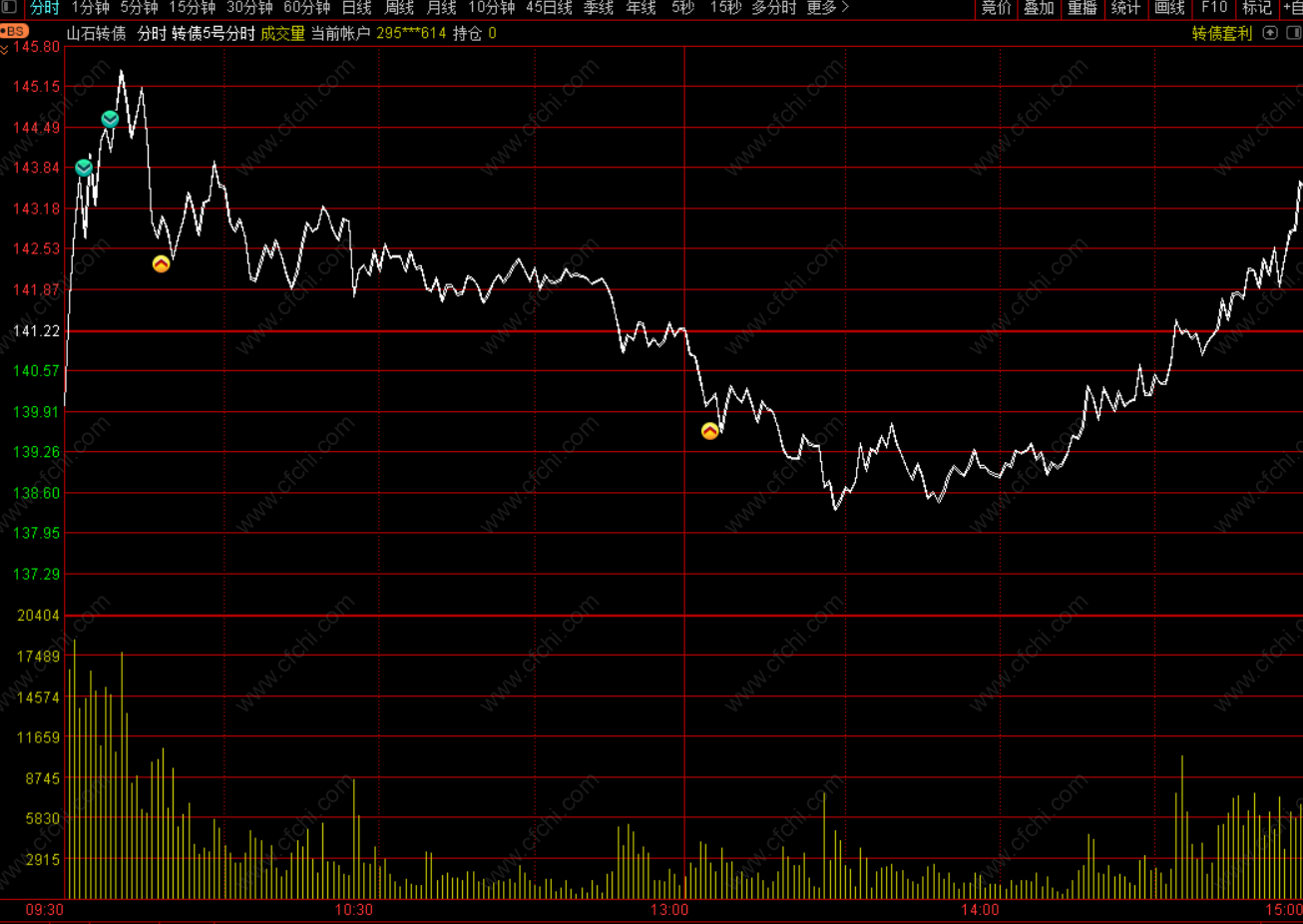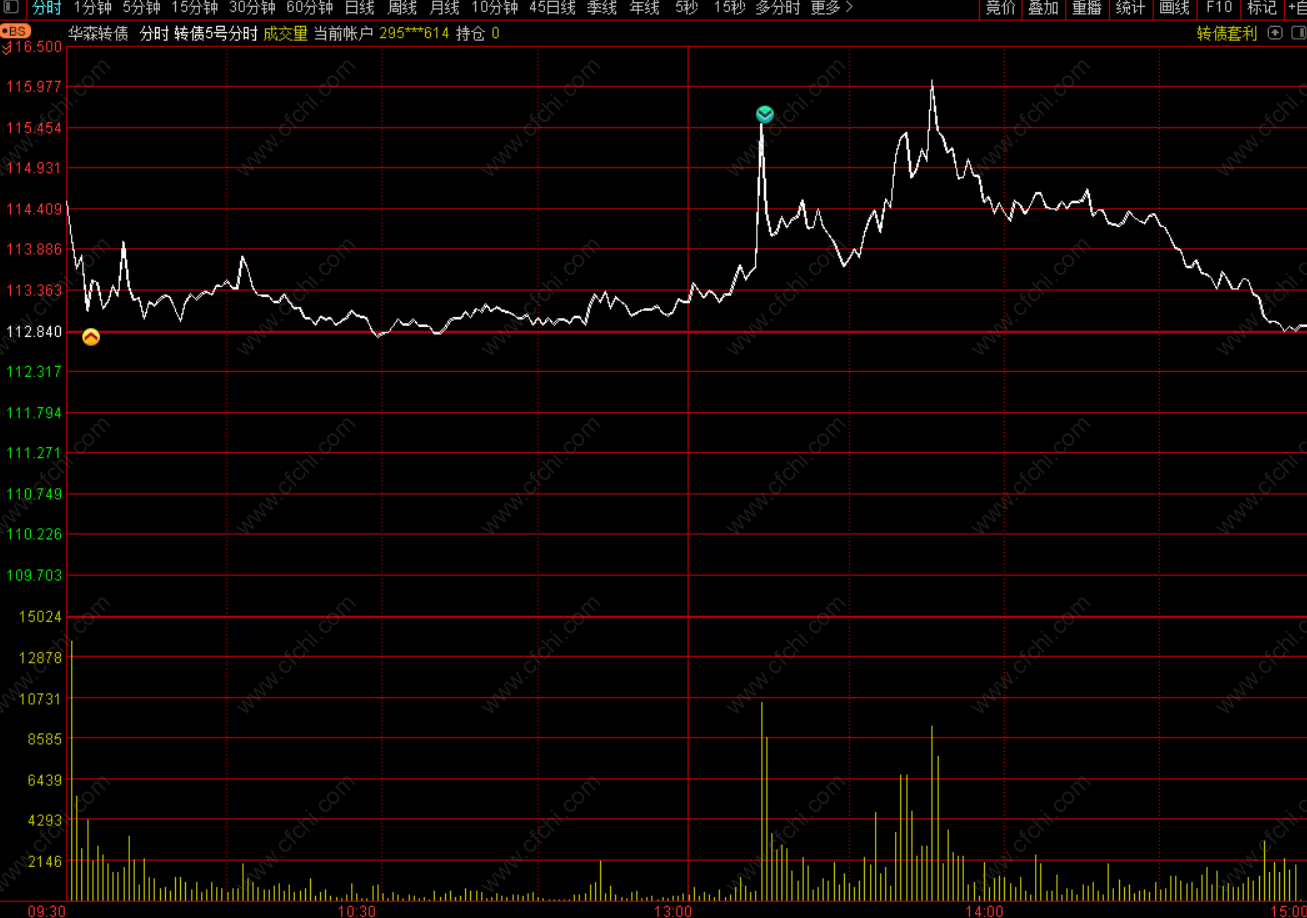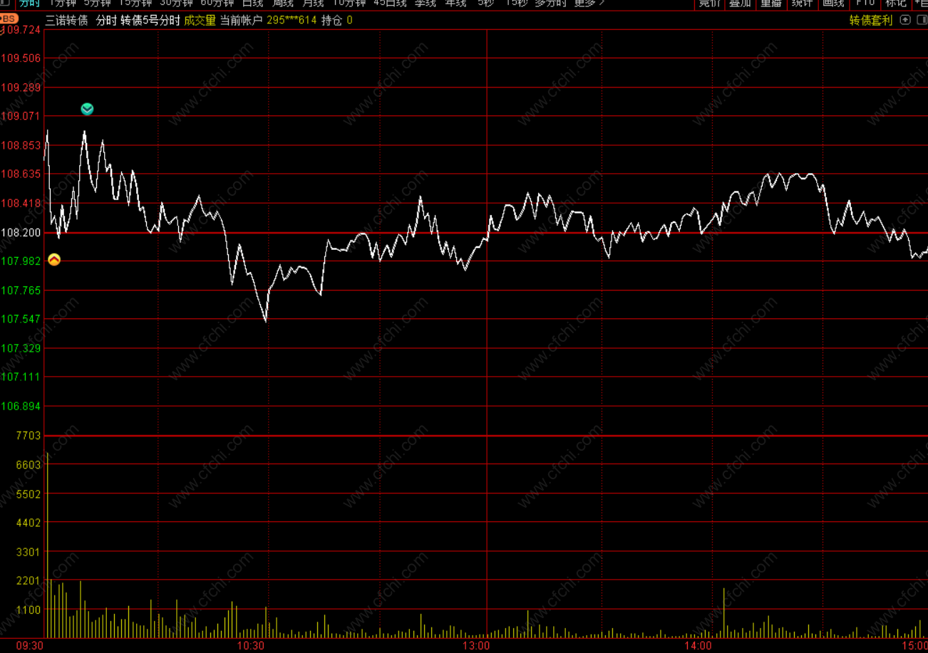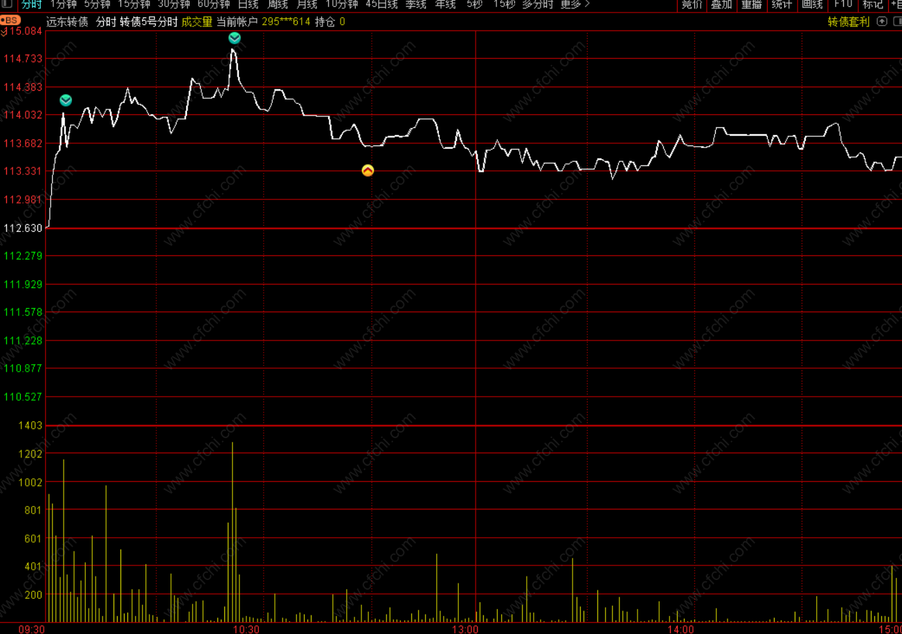 然后用财神转债分时指标操作当天的买卖点(黄色圆圈信号为买入信号,蓝色圆圈信号为卖出信号),需要注意的是不要一看到信号马上就买卖,应该等几秒钟,等信号稳定后再操作买卖,财神分时指标不含有未来函数,信号确定后不漂移。