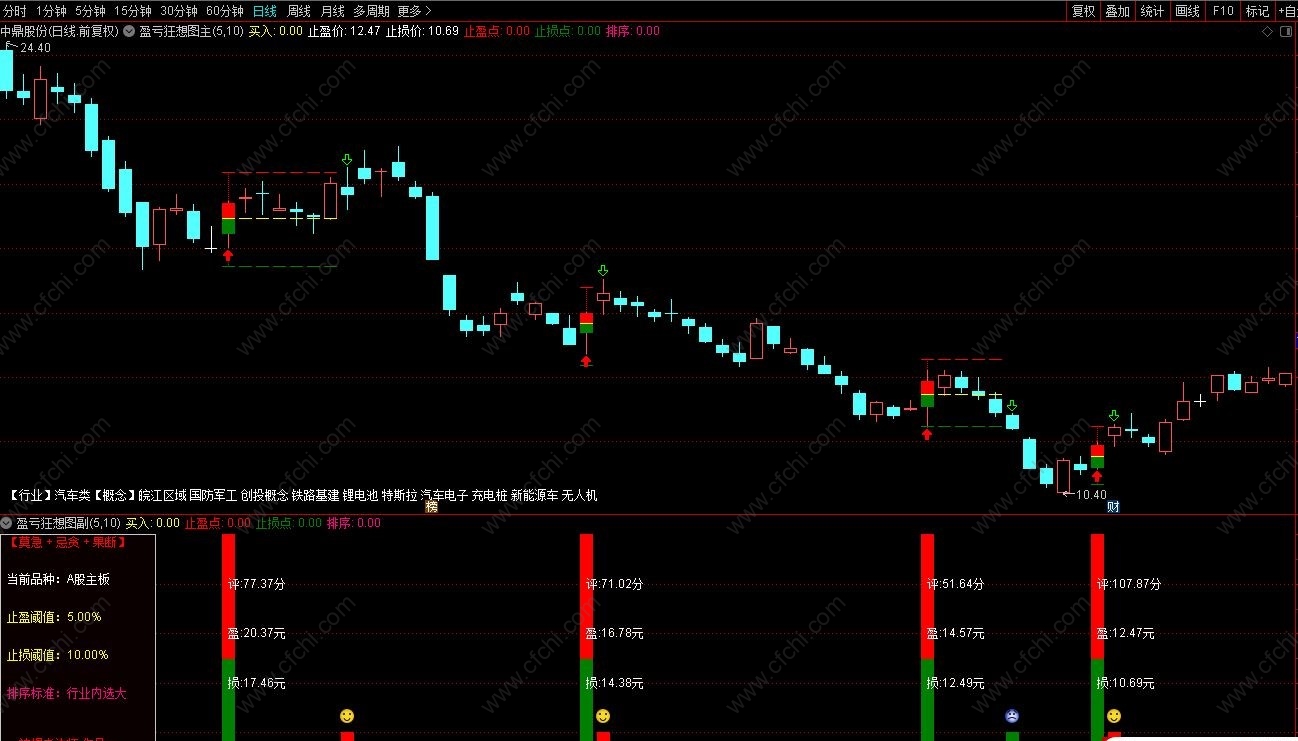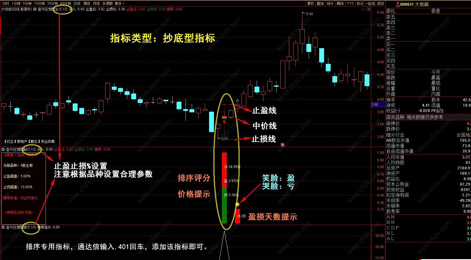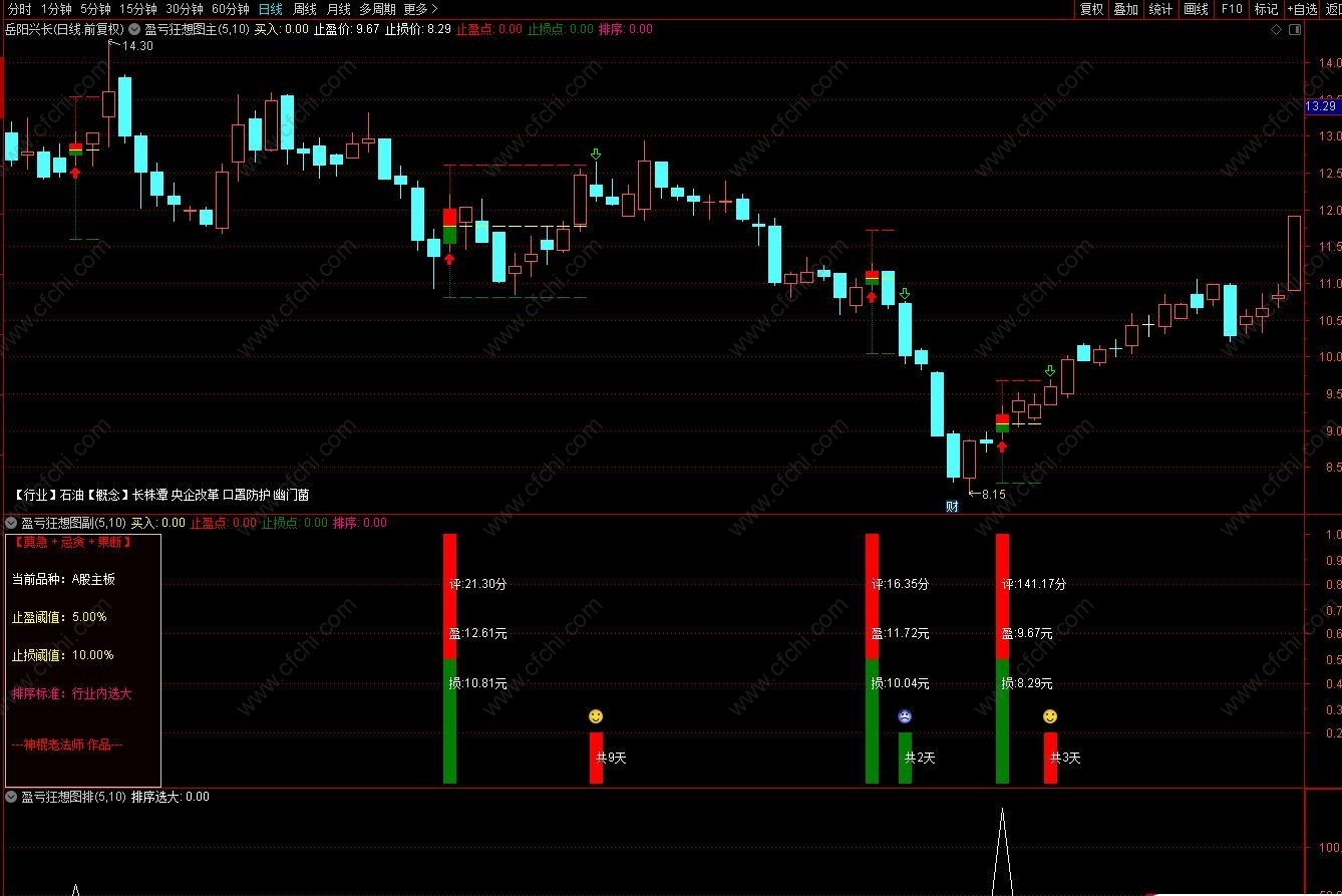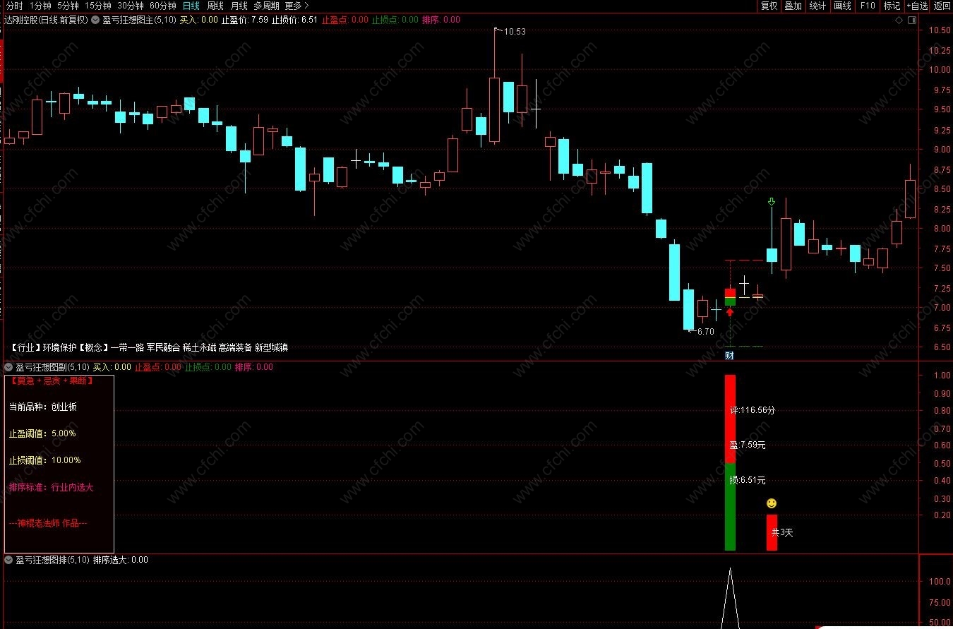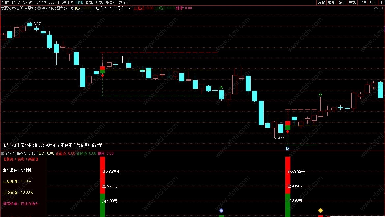 3、副图描述:左侧有当前品种提示,止盈和止损可以根据主板与创业板等涨幅不同,设置不同百分比。