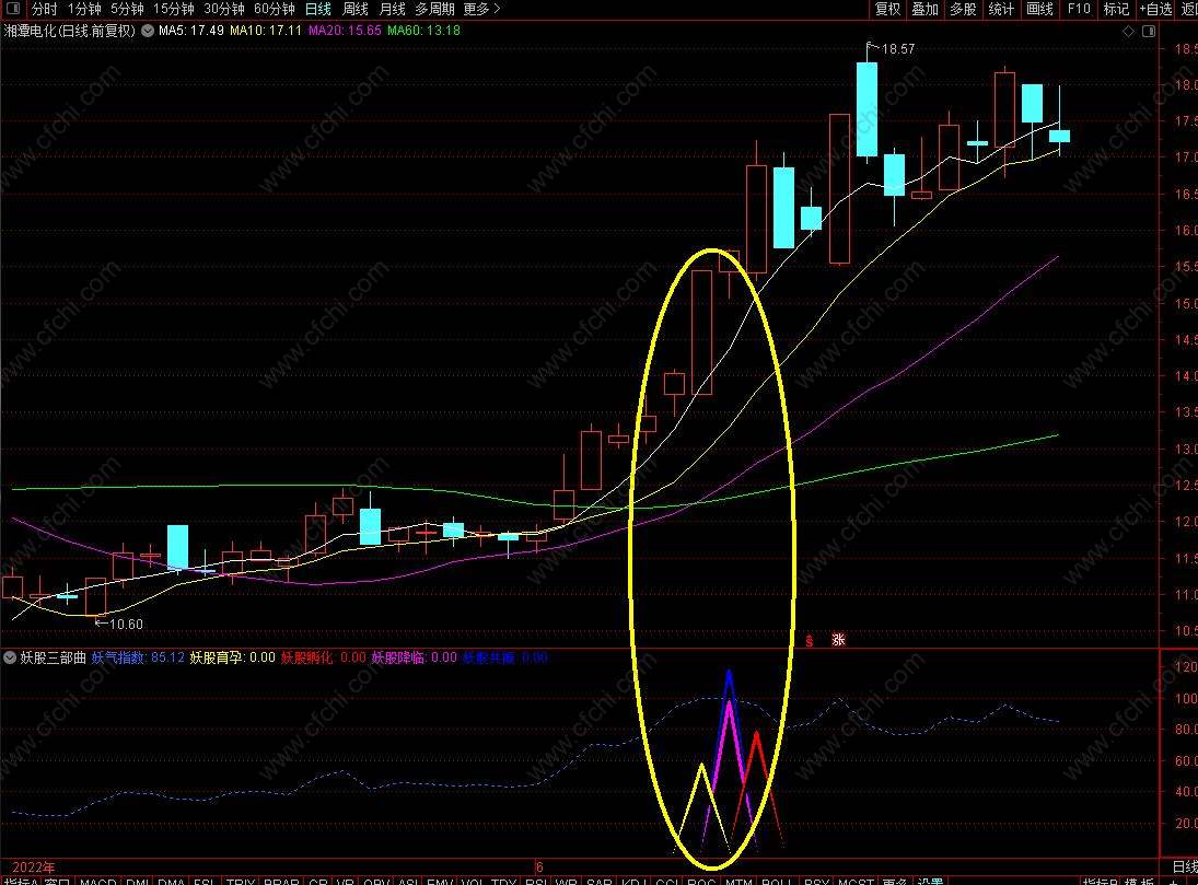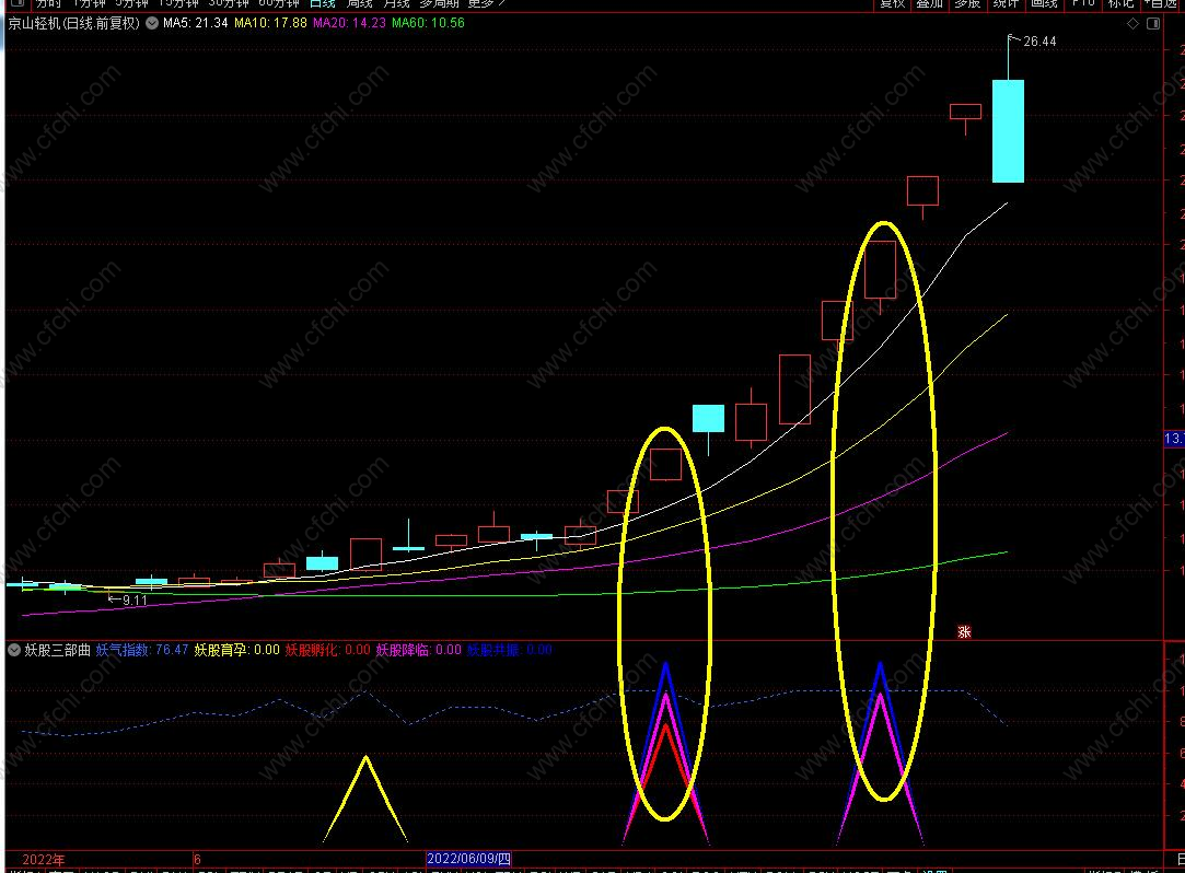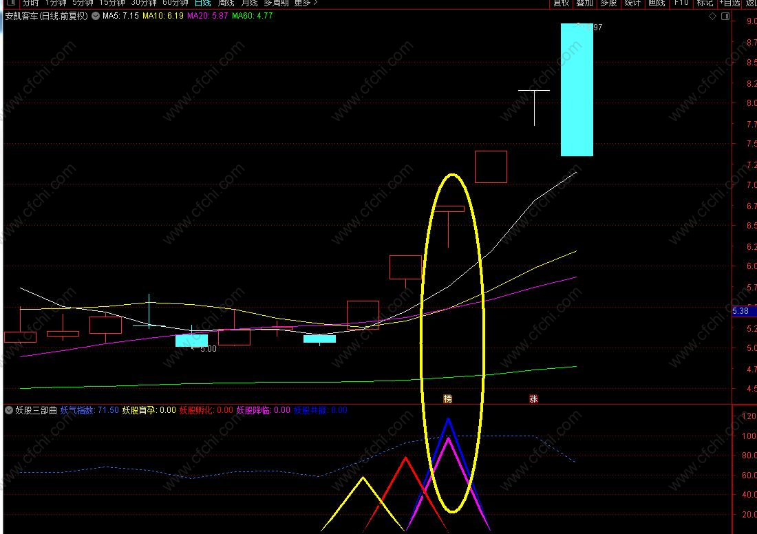 指标使用注意:依次出现妖股育孕,妖股孵化,妖股降临(信号间隔越近,妖气越足),三种信号同时出现也就是幅图上的蓝三角柱,越容易出现大妖股!